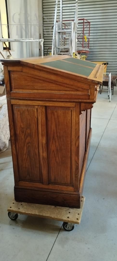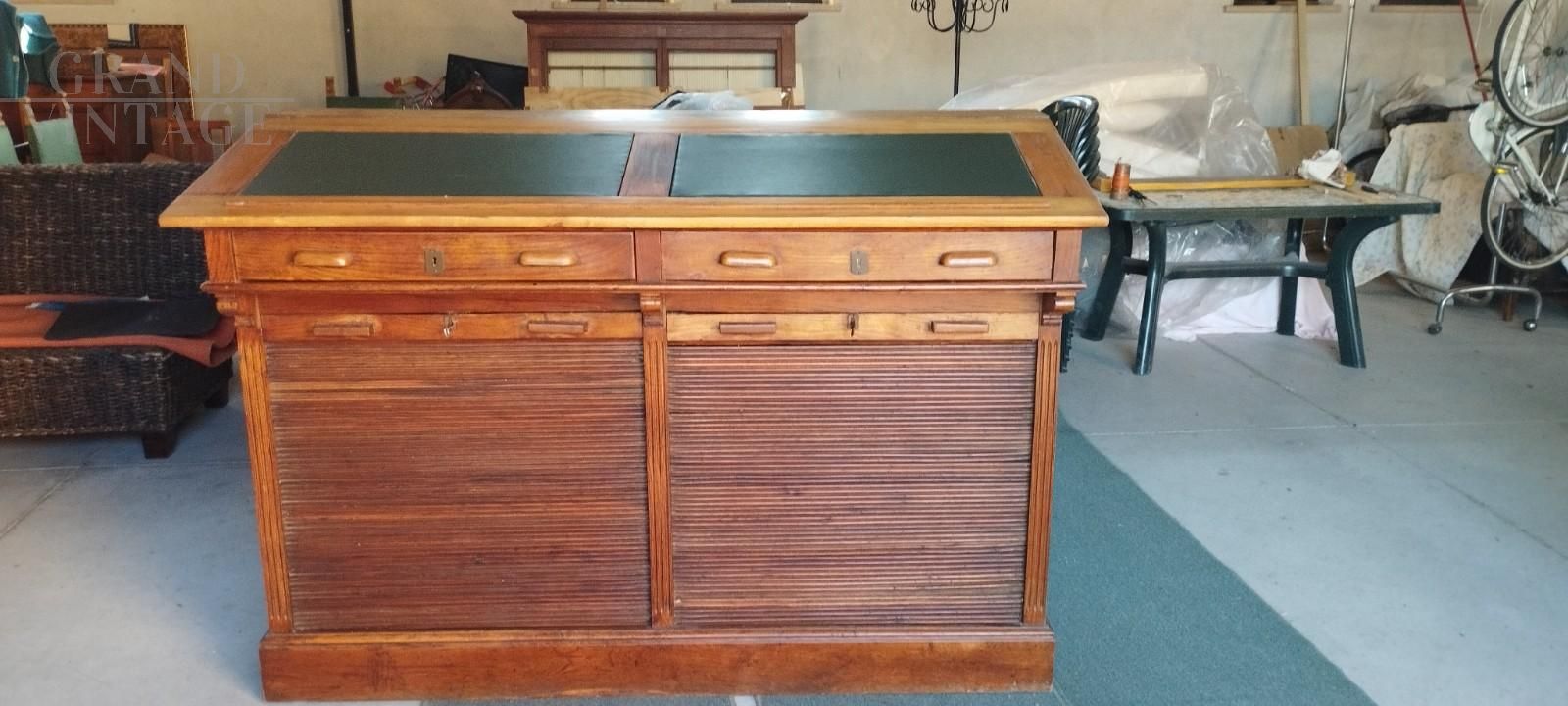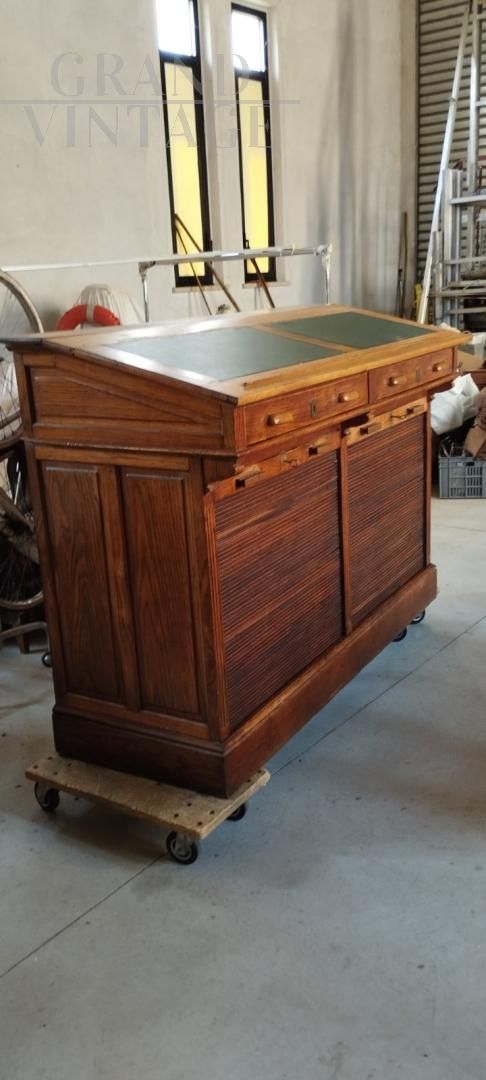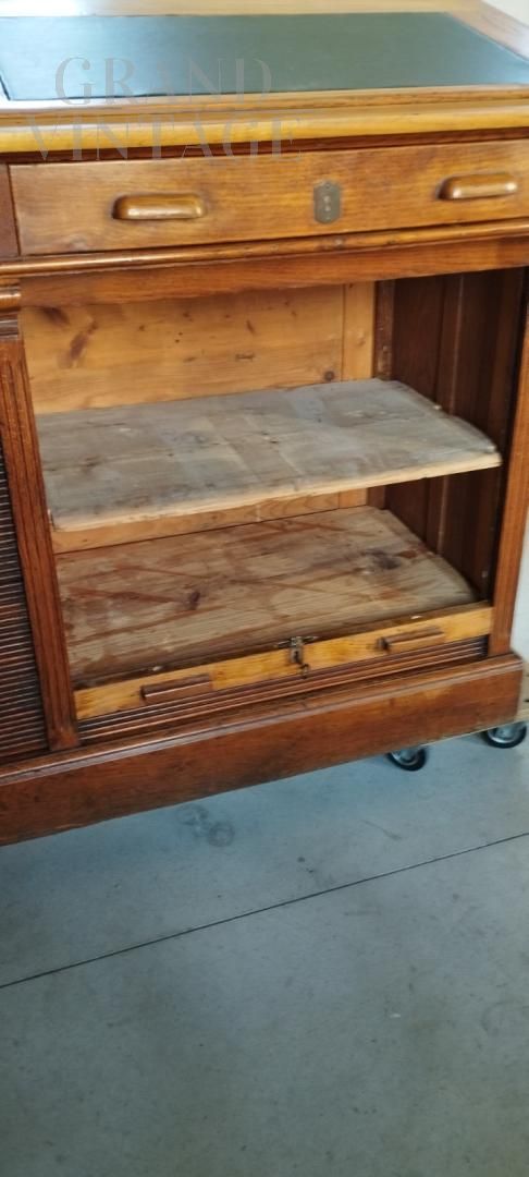Vintage desk unit with roller shutter filing cabinet from the 1930s, the roller shutter doors conceal compartments for documents, perfect for use as filing cabinets or archives.