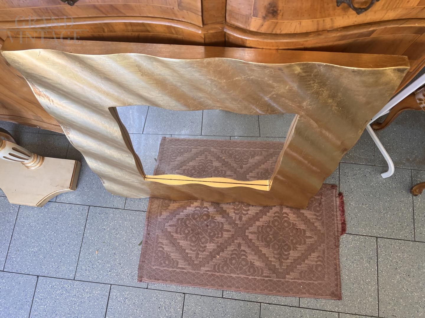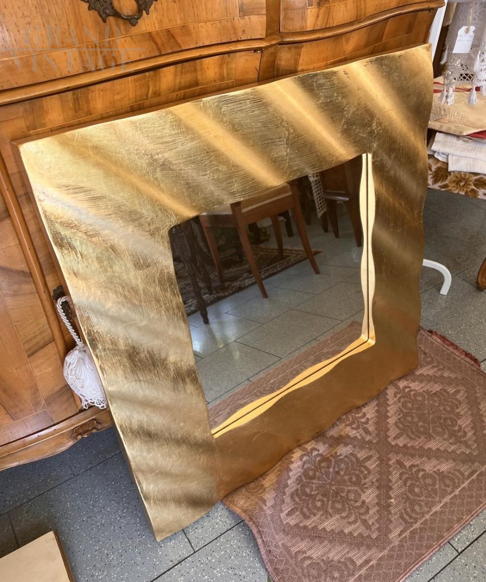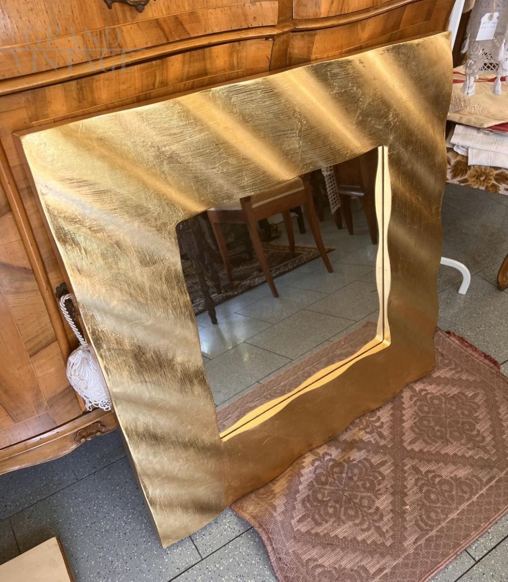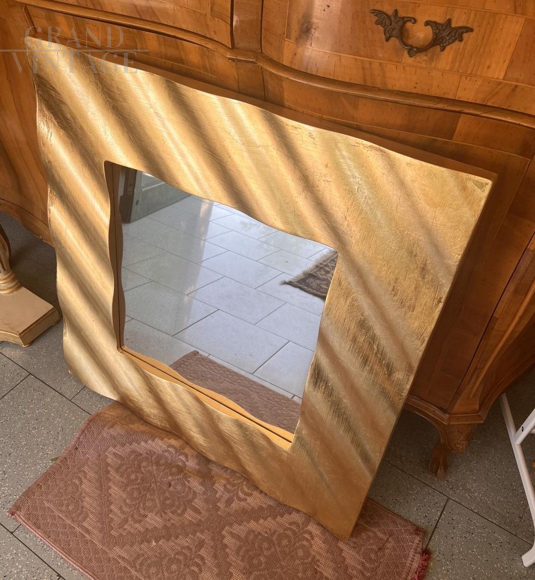 Large modern square mirror with elegantly wavy gilded wooden frame. Perfect for playing with the styles of your homes.