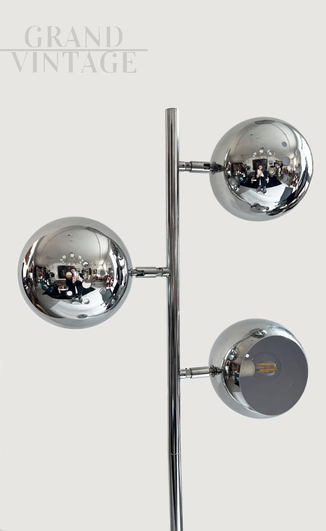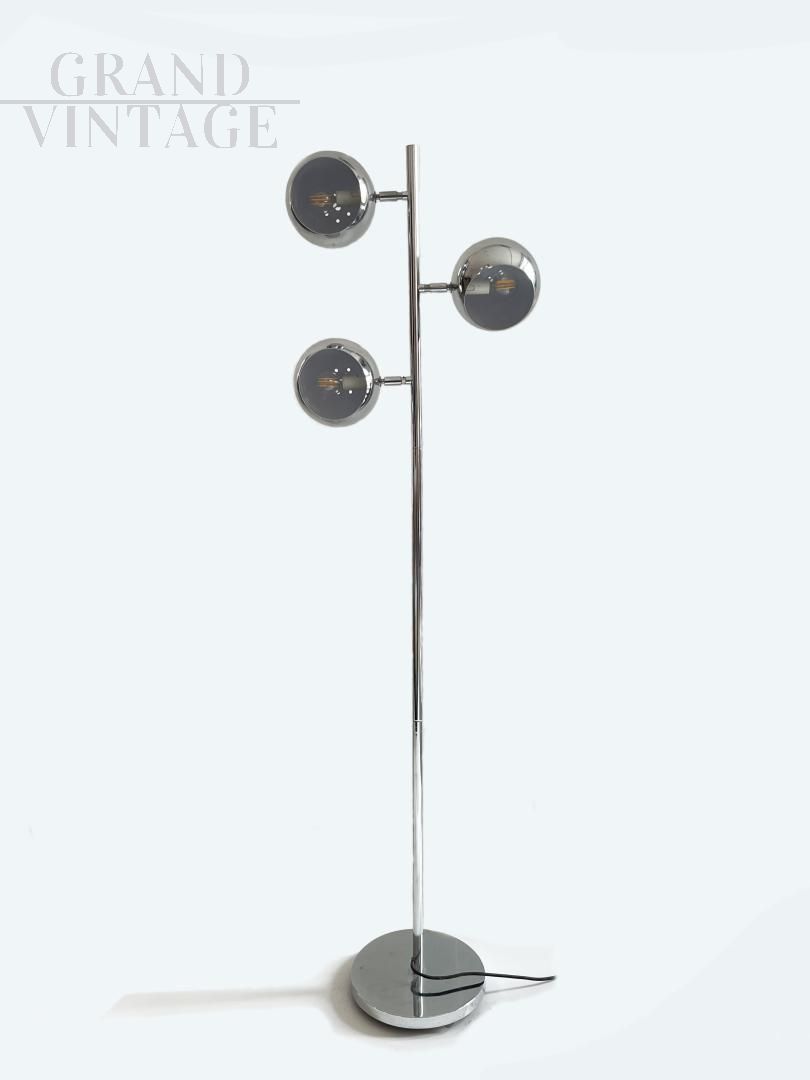 Elegant design floor lamp in Reggiani style from the 1970s, entirely in steel with three directional light points, Italian modern art.