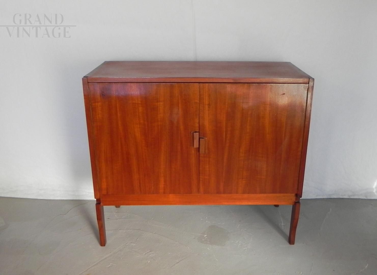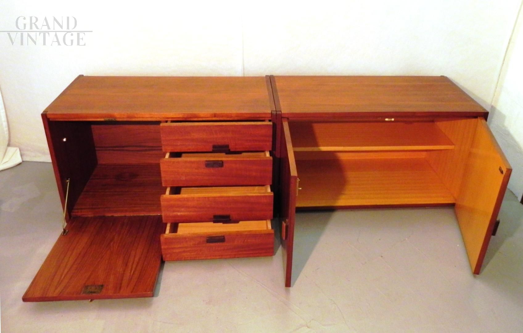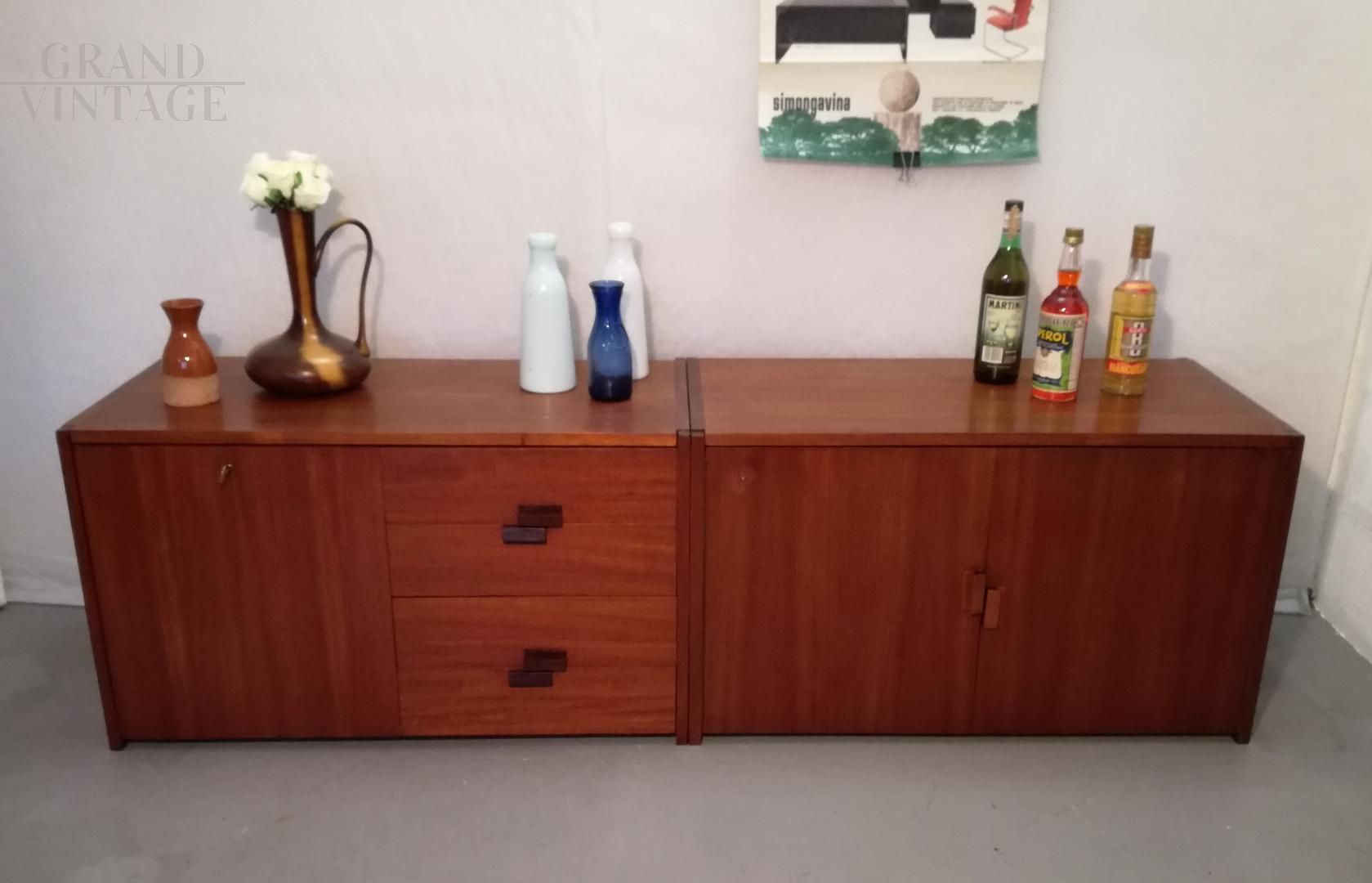 Modular living room furniture that can be used as a sideboard or cupboard in mahogany, 1960s. It is a modular piece of furniture that can be assembled in various configurations, with a plywood structure covered in mahogany. Can also be used double-sided, very careful in design and construction. The handles are made of solid wood and are deliberately asymmetrical, forming a particular design. The piece of furniture shows various signs of use, as shown in the photos.