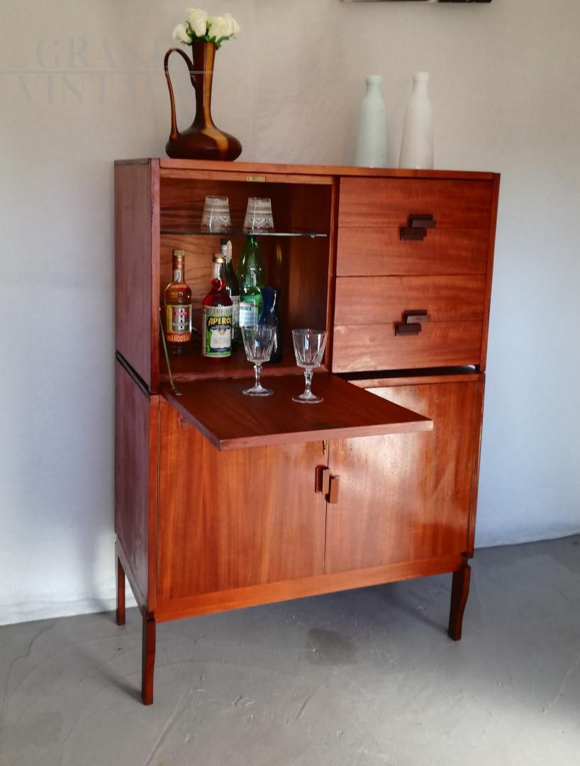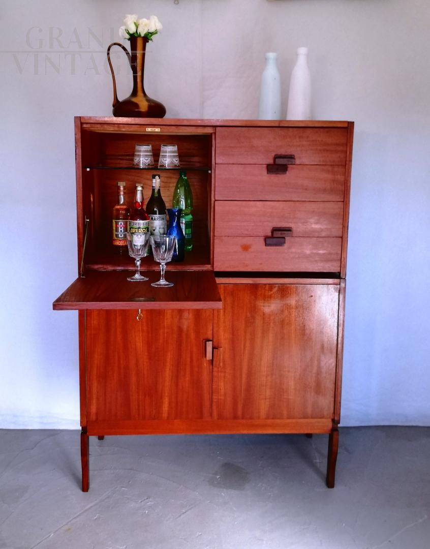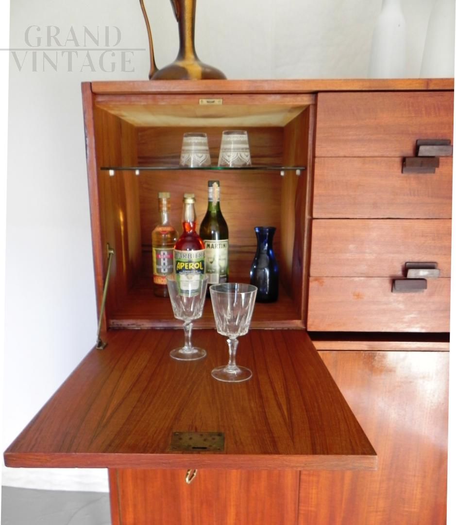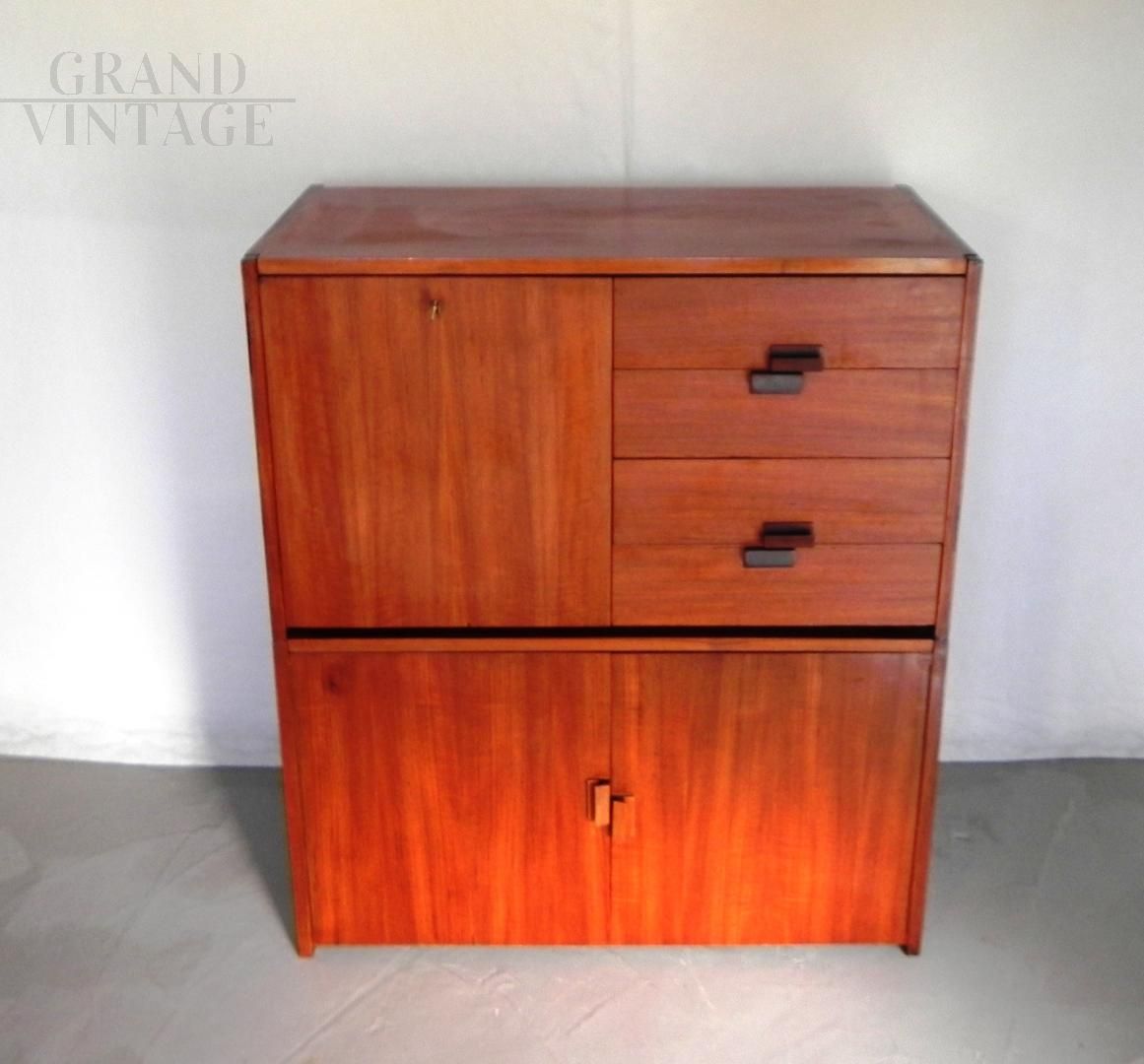Modular living room furniture that can be used as a sideboard or cupboard in mahogany, 1960s. It is a modular piece of furniture that can be assembled in various configurations, with a plywood structure covered in mahogany. Can also be used double-sided, very careful in design and construction. The handles are made of solid wood and are deliberately asymmetrical, forming a particular design. The piece of furniture shows various signs of use, as shown in the photos.