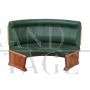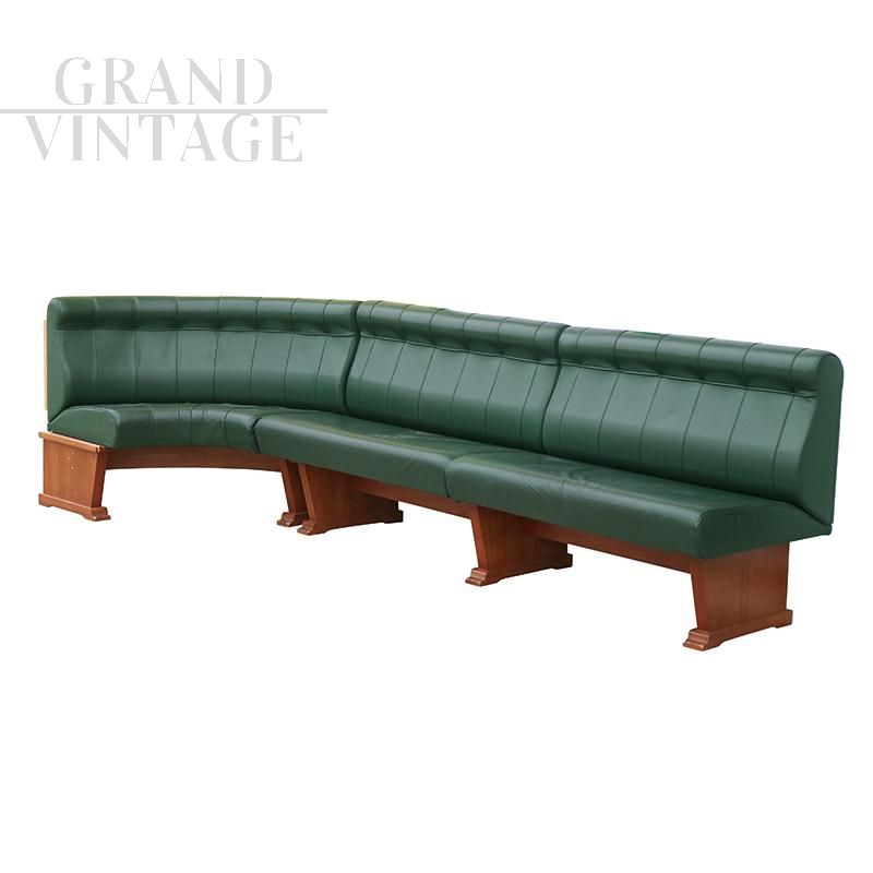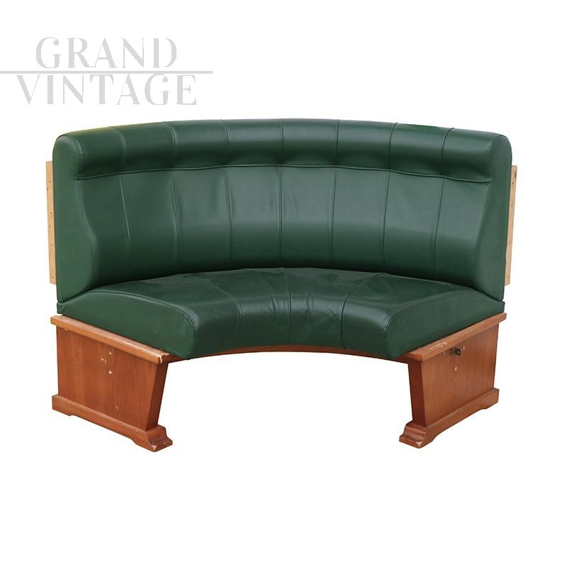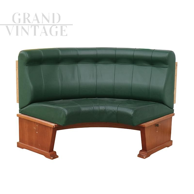 Vintage modular corner circular wall bench or sofa in green leather with wooden structure.