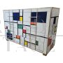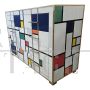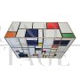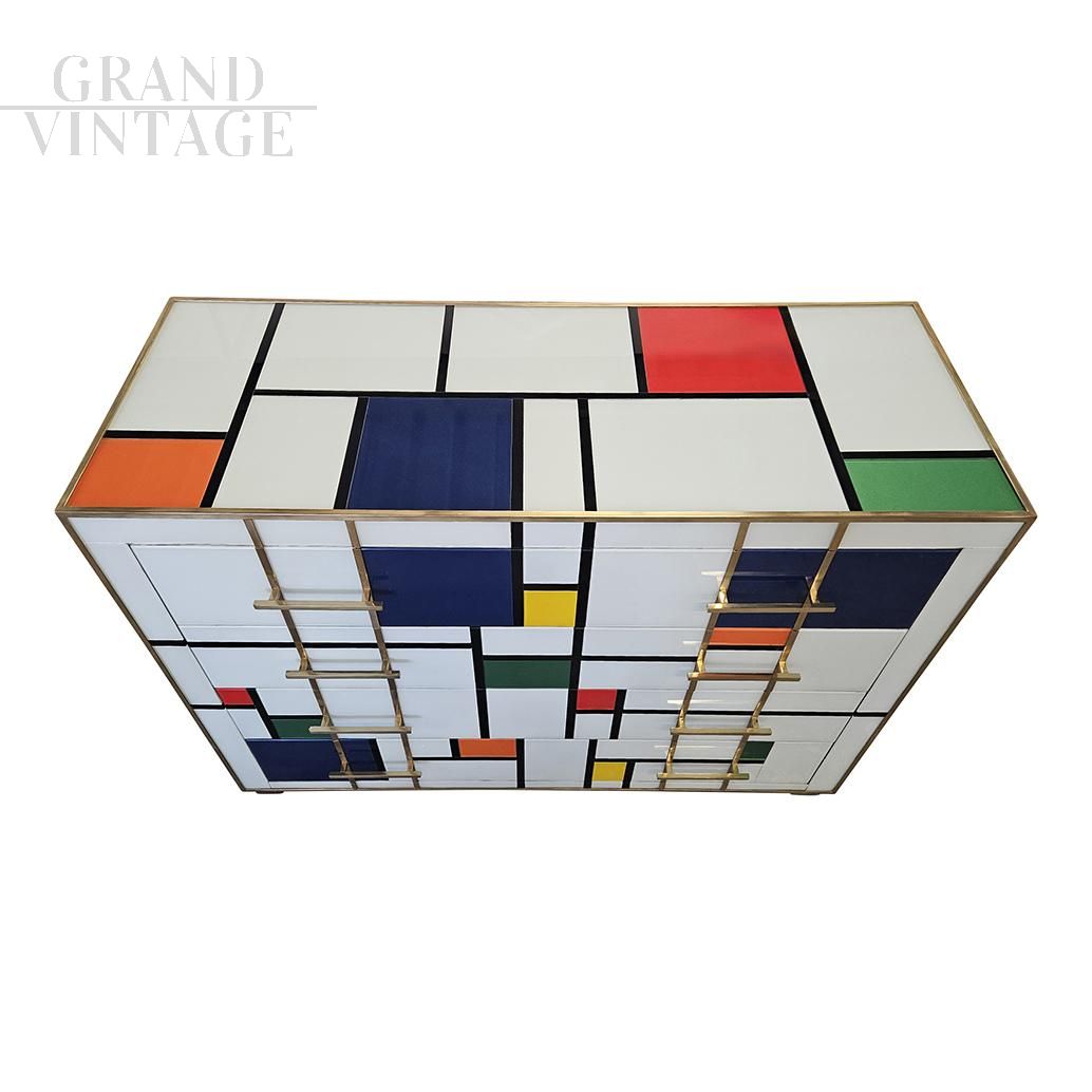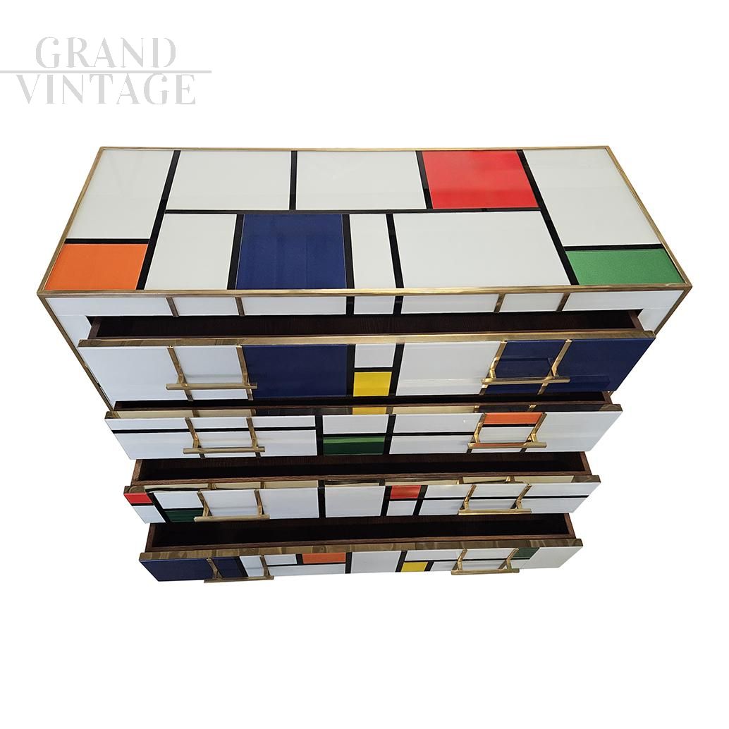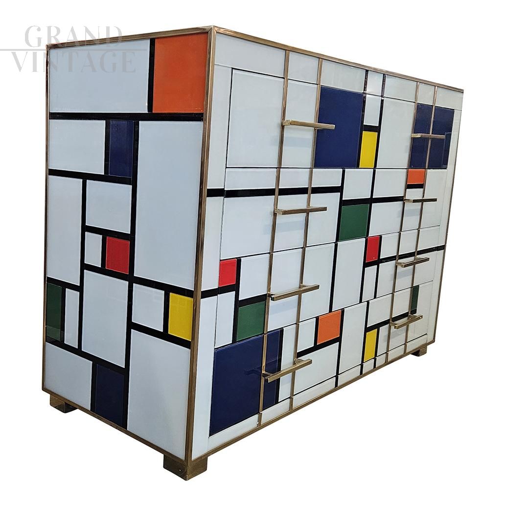 Dresser with four drawers entirely handmade with wooden structure covered in Mondrian style multicolored glass tiles; profiles, handles and feet in golden brass.