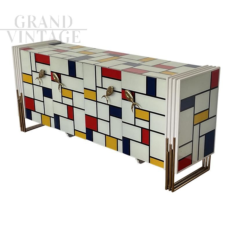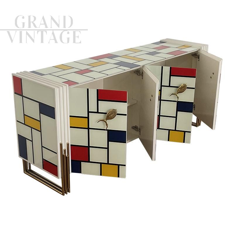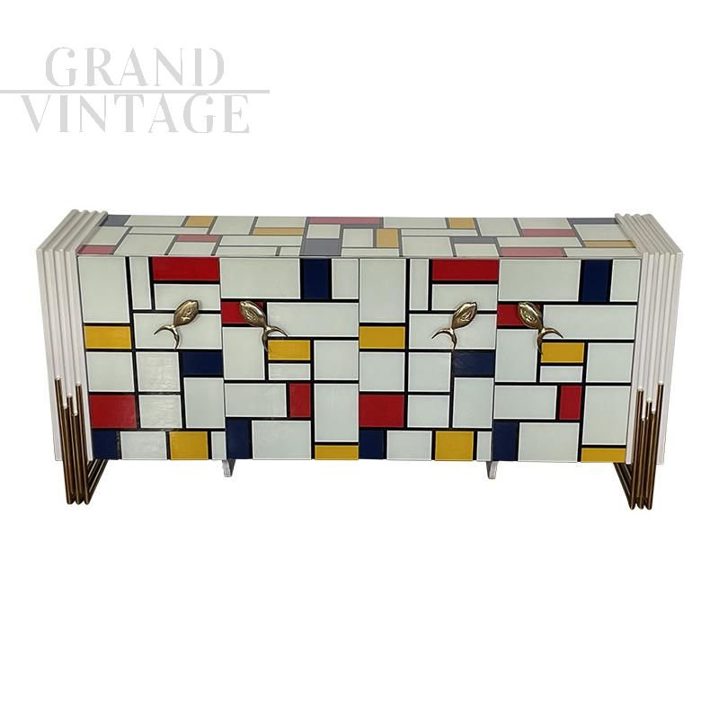 Four-door sideboard entirely handmade, with wooden structure and surface finishes in Mondrian style colored glass on a white background. White lacquered frame, tubular feet in golden brass, golden fish-shaped handles, equipped with internal shelf.
