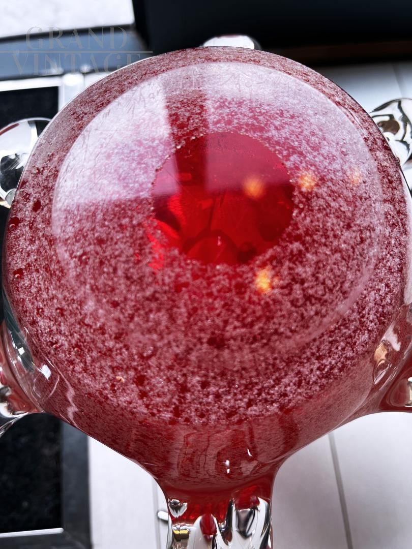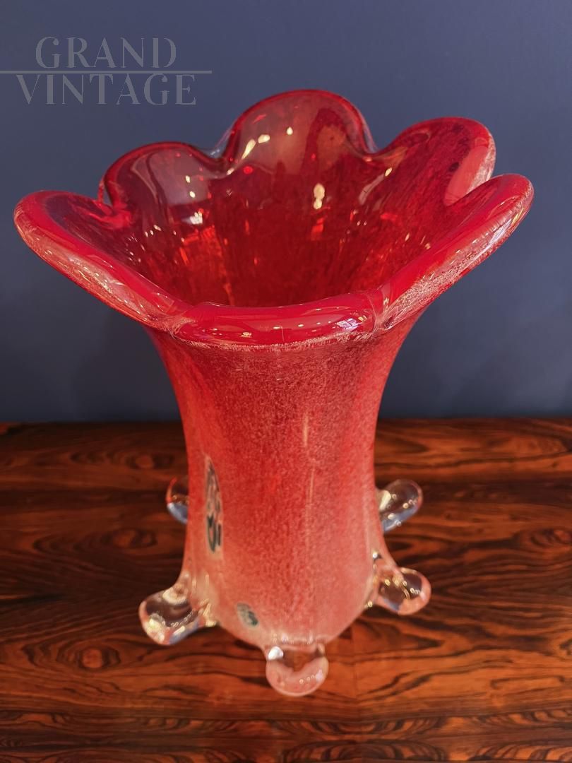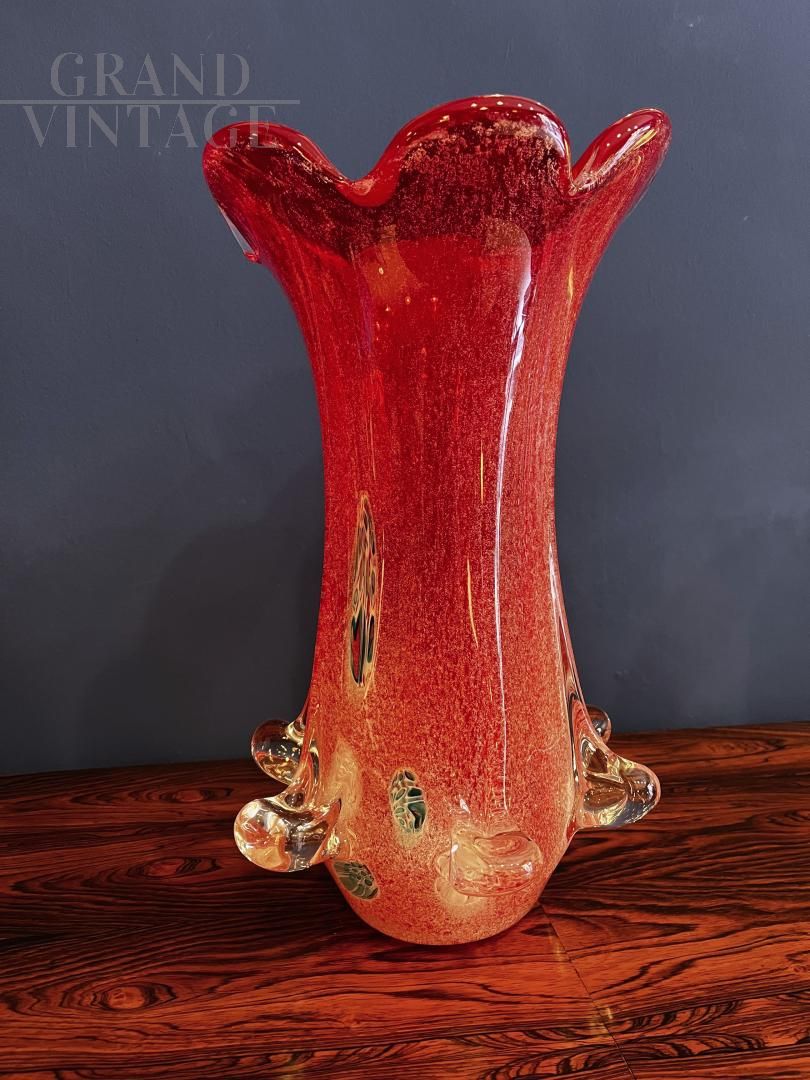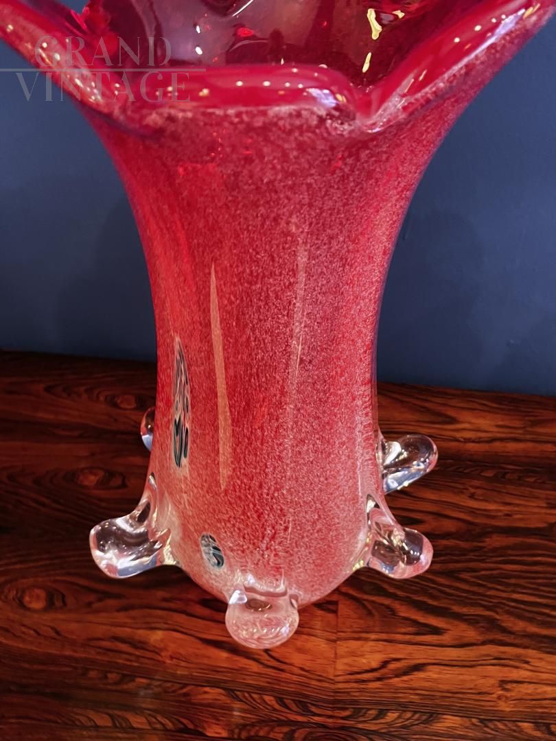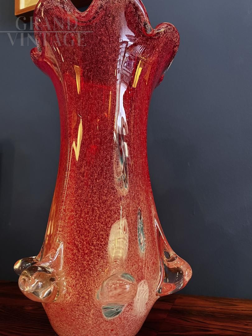 Magnificent red Murano glass vase, signed Moretti in engraving under the base, Italy 1960s. The shape is very particular and elegant. It is in excellent condition, without any damage.