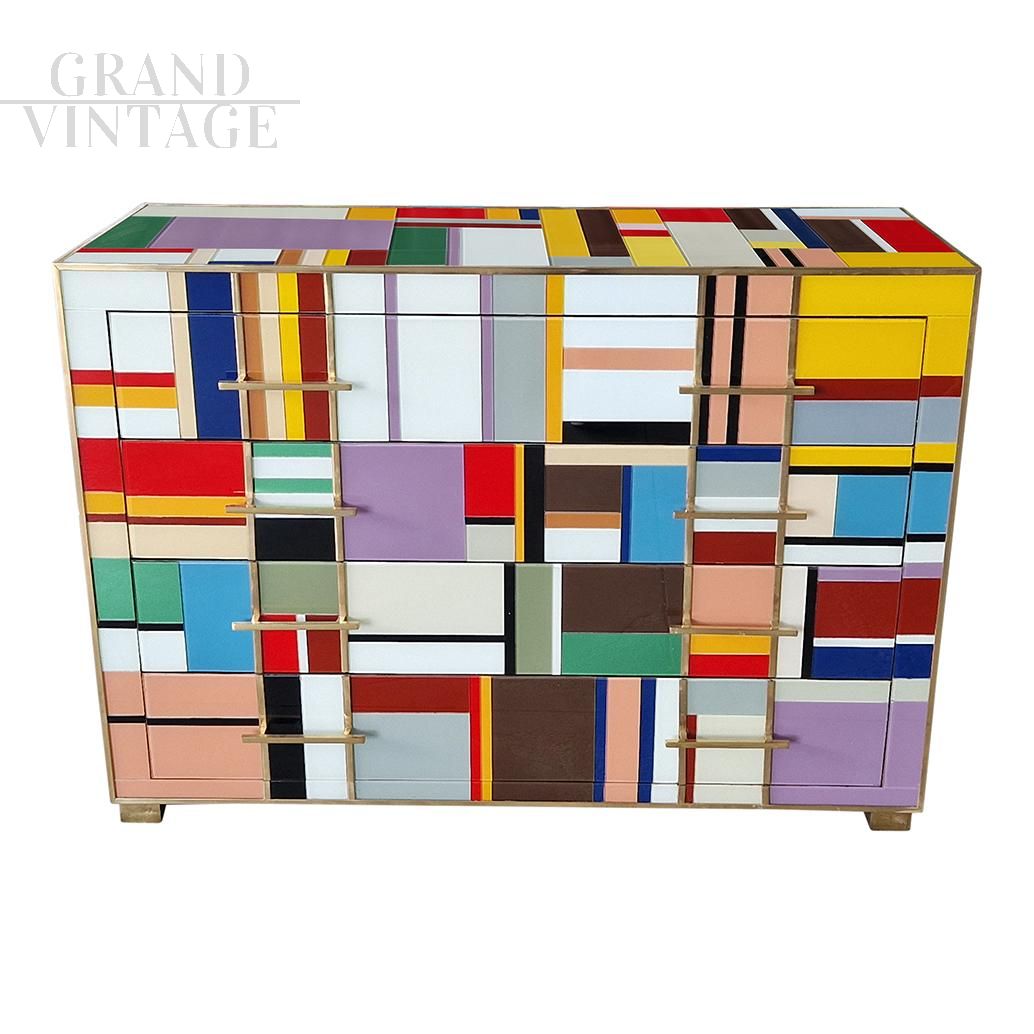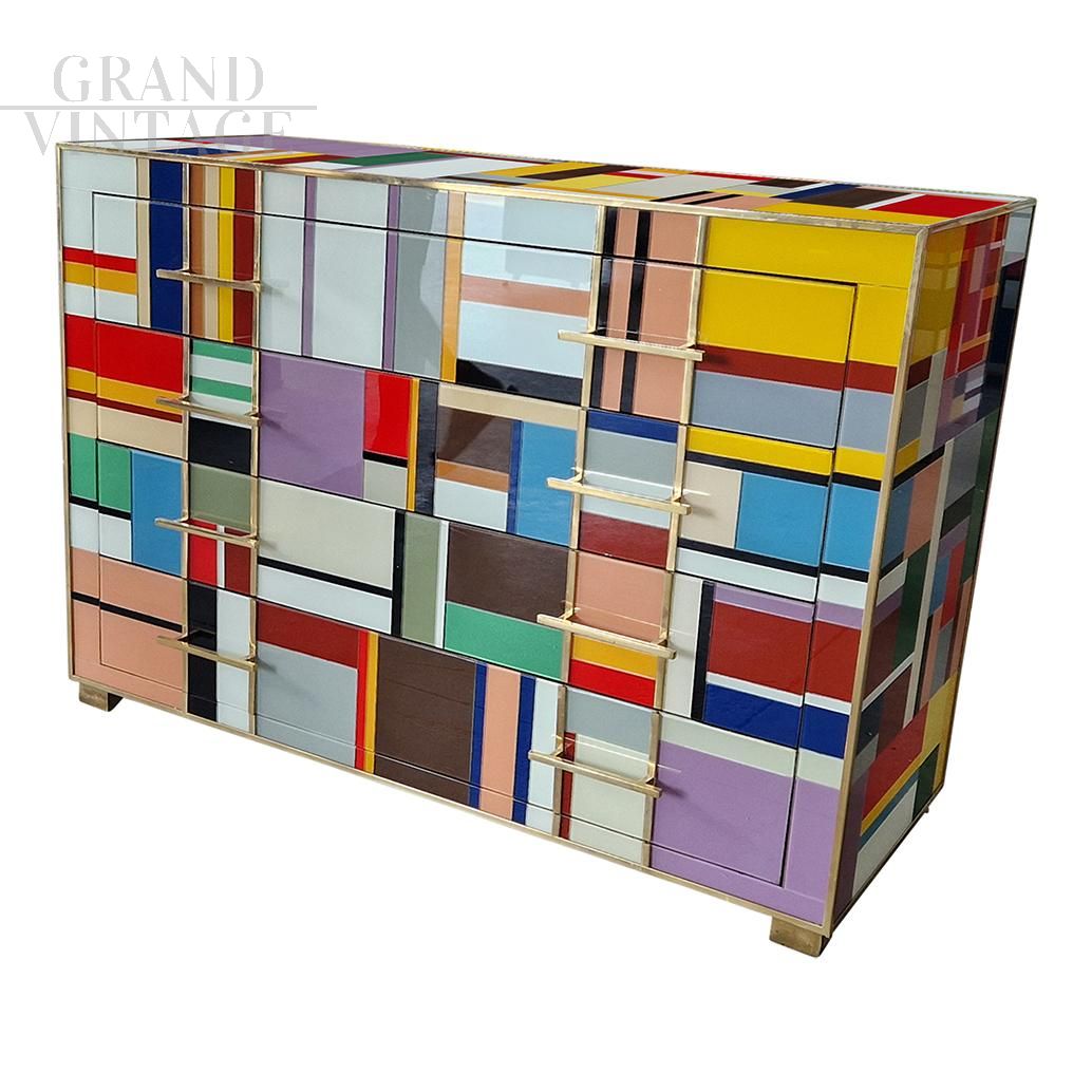 Dresser with four drawers entirely handmade, with wooden structure covered in multicolored glass tiles; details, handles and feet in golden brass.