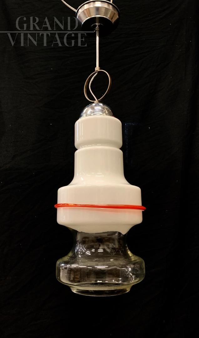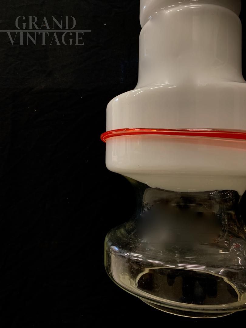 Beautiful Leucos pendant lamp in Murano glass, 70s, with 1 light inside the cup. Medium-sized chandelier, it has a beautiful and delicate line with a red outer edge, typical of the Leucos company. The glass of the cup is transparent at the bottom, and creamy white with a red border at the top. Structure in brass and iron, glass intact and not cracked, it has some signs of aging on the structure. Electrical system redone, suitable for use with E27 Led bulbs. Suitable for all environments, it does not dazzle if milky white bulbs are fitted.