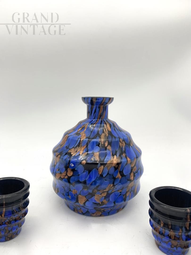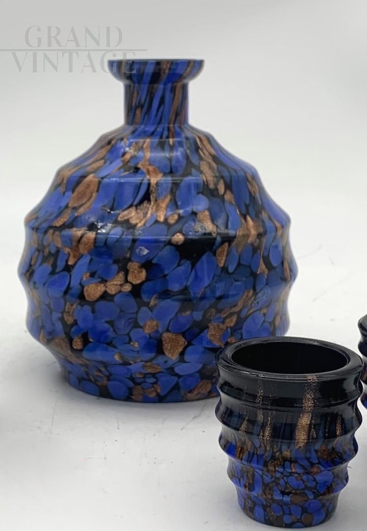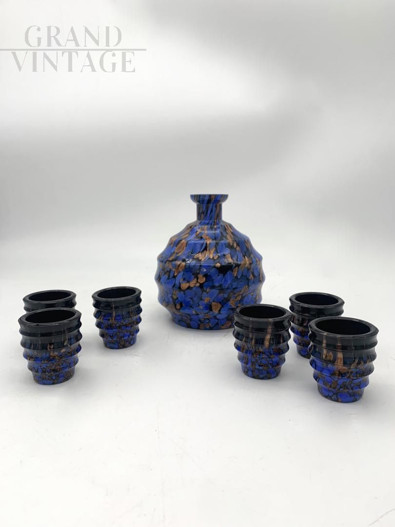 Beautiful Murano glass coffee set attributed to the Toso company, Italy 1930s, consisting of a bottle - carafe and six cups, all in artistic glass worked in blue, gold and black, with elegant wavy shapes. The glass paste has a good consistency and has no cracks. The set was handmade, beautiful, elegant and rare.