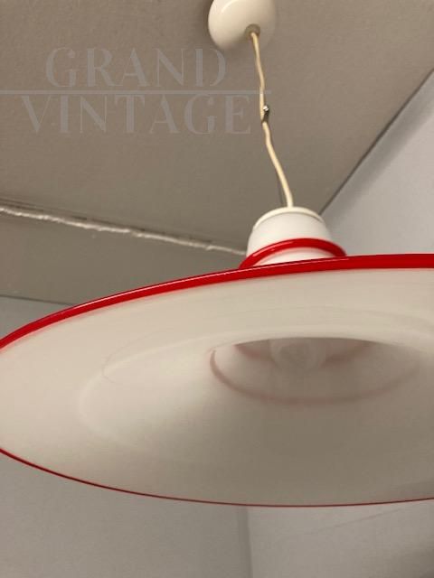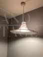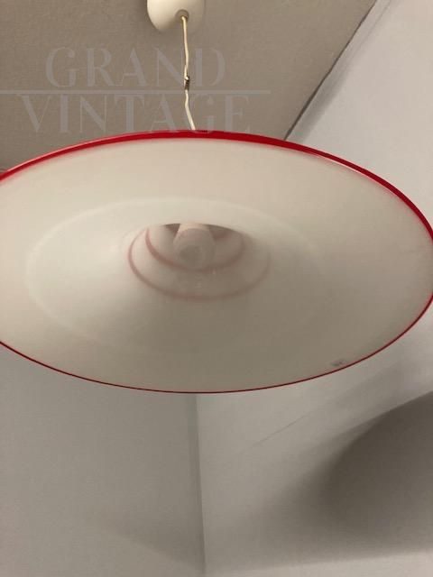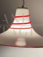 Suspension lamp in Murano glass with the characteristic shape of a Witch's Hat, from the 1970s, with a particular design with this very fine, very delicate effect. In white glass and red thread finishing. In perfect condition, with overhauled electrical system.