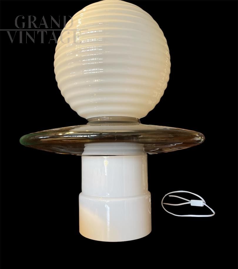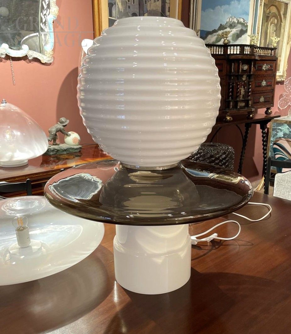 Particular design lamp in white and smoked Murano glass composed of three distinct elements which, when superimposed, make up a magnificent furnishing lamp.