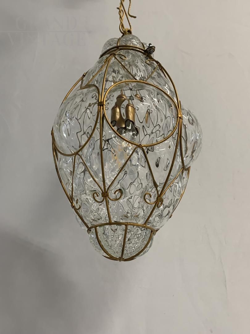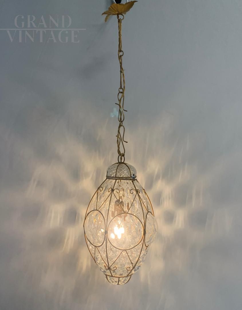 Medium-sized Murano glass hanging lantern, elegantly decorated with a golden brass structure worked in curls, which wraps around a finely decorated glass body. The lantern, when lit, creates suggestive plays of light on the surrounding walls, thanks to the texture of the glass and the light refraction; the cable and chain have a golden braided covering that perfectly matches the structure of the lantern, giving it a classic and refined look. Ideal for elegant environments such as entrances, living rooms or dining rooms, this lantern combines artistic craftsmanship. Lantern attributed to the company A.V.E.M with new electrical system; has an e27 lamp holder. Dimensions Total height: 82 cm Lantern height: 40 cm Width: 25 cm
