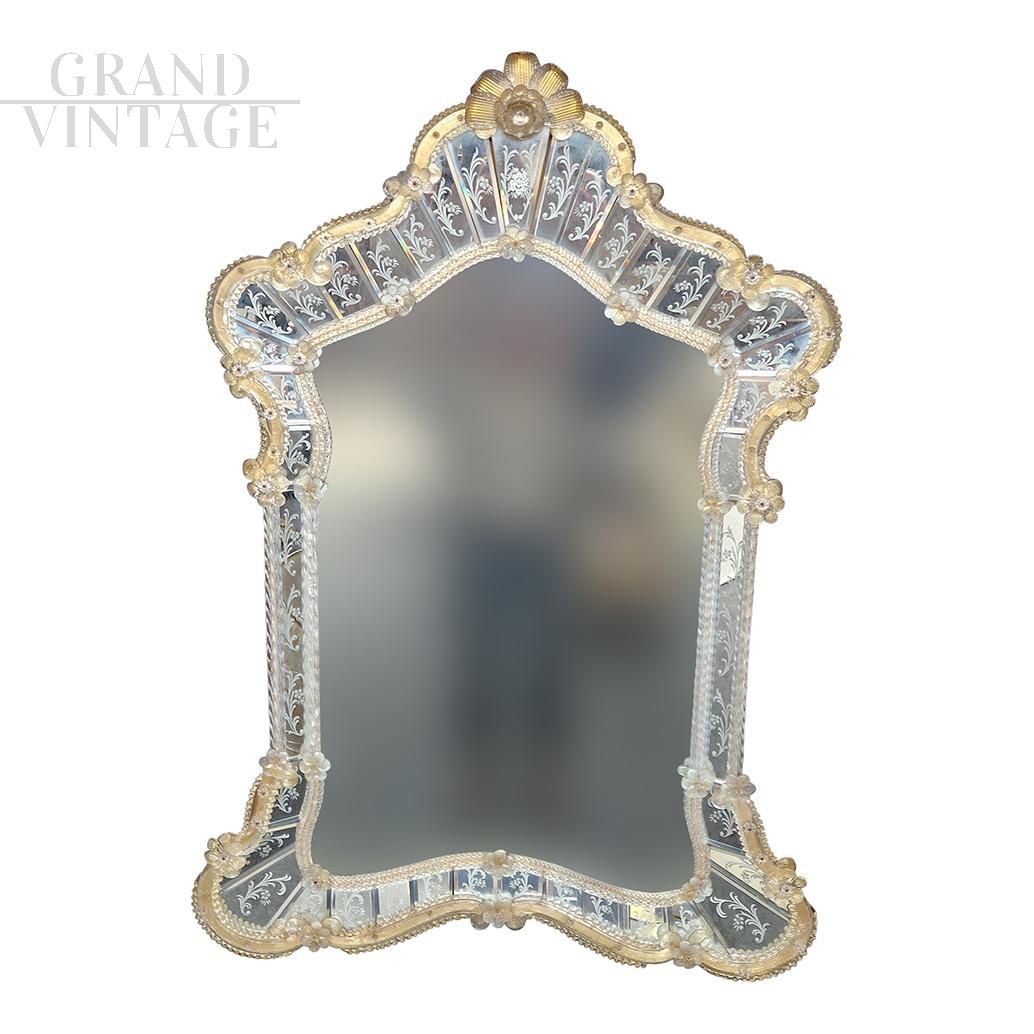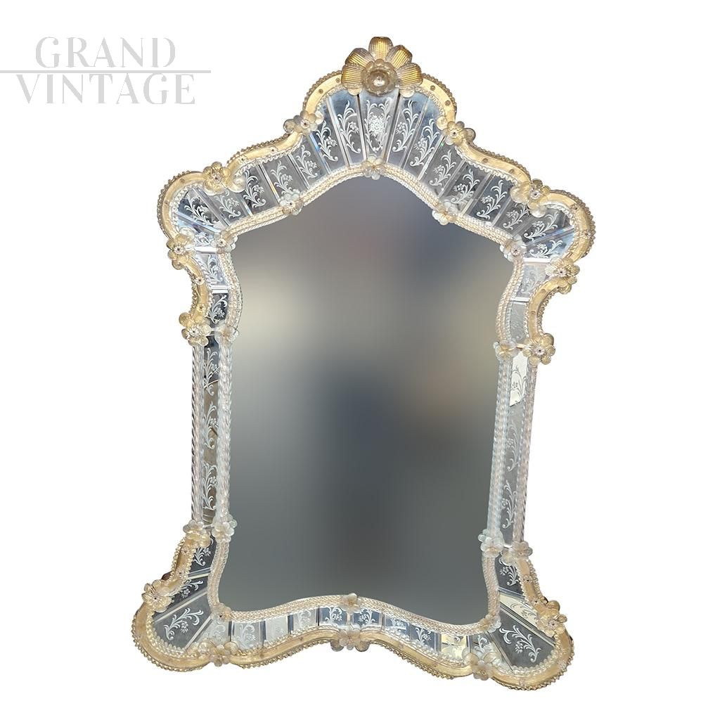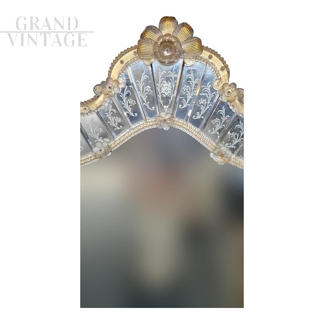 Elegant Venetian mirror made in the most rigorous Murano tradition with rich bands carefully engraved by hand. All assembled with golden crystal elements handmade in the Murano furnaces. Period mid 1900s.