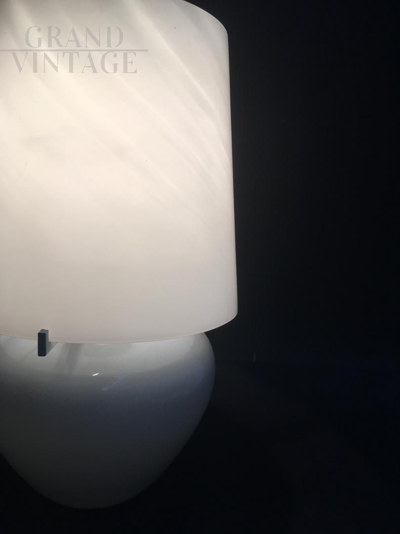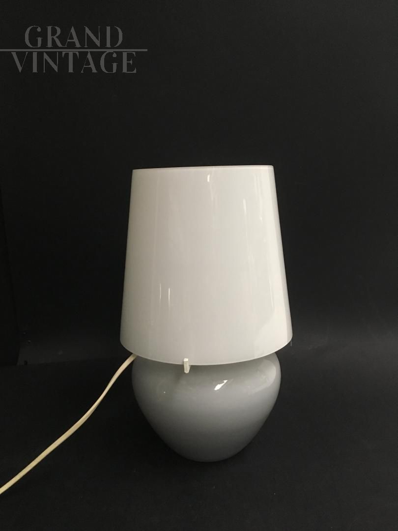 Table lamp in good condition, totally made of glass, consisting of 2 glasses, one above the other, joined by the iron frame. The lower glass is light gray while the upper glass is cream colored. The 2 glasses are not chipped or cracked, they are in excellent condition. Vintage from the 70s.