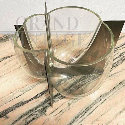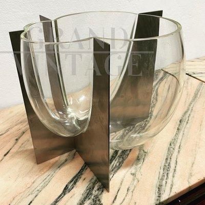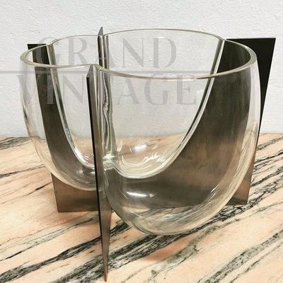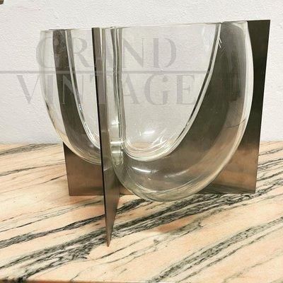 Sculpture vase S509 by Carlo Nason for Mazzega in Murano glass set in steel plates, a stunning sculptural object from around 1969. The beautiful round lines of the glass complete the straighter edges of the stainless steel. Perfect as a superb centerpiece or as a decoration to show off on a console or table.