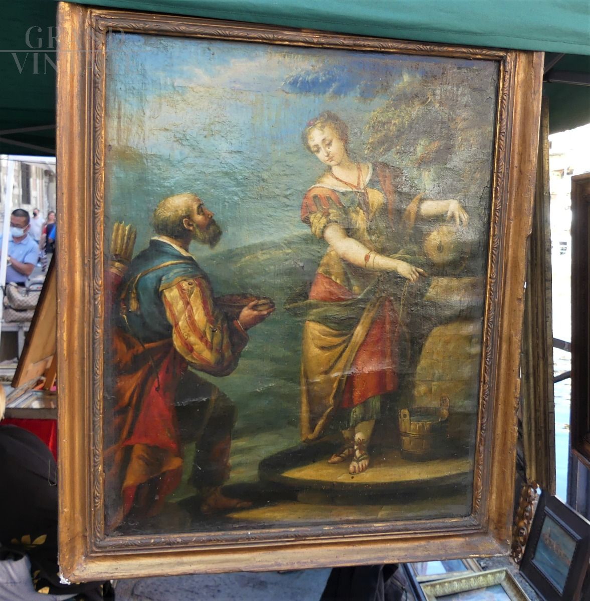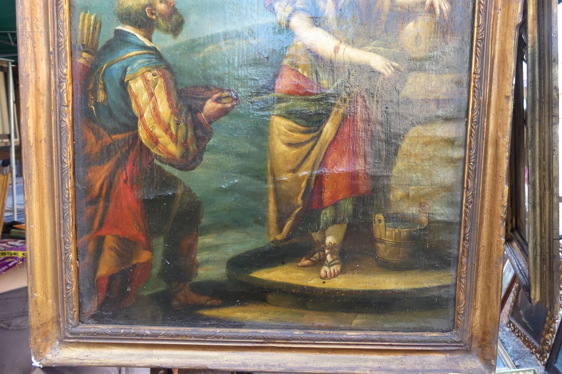 19th century painting from Lombardy depicting a mythological scene, unsigned, the original frame has a chipping on one side, visible in the photo.