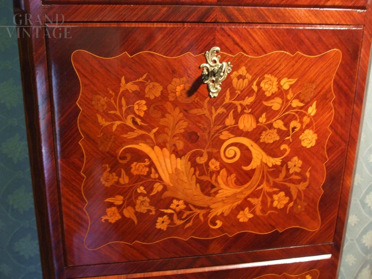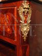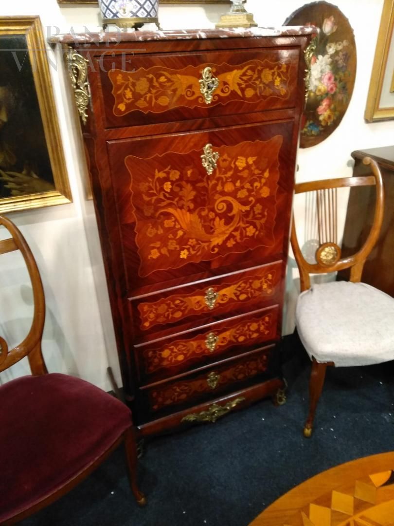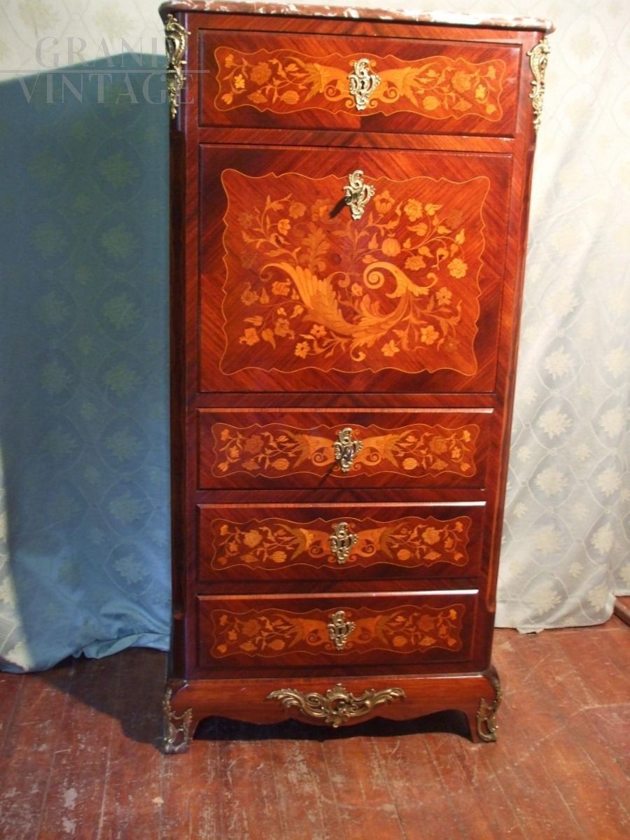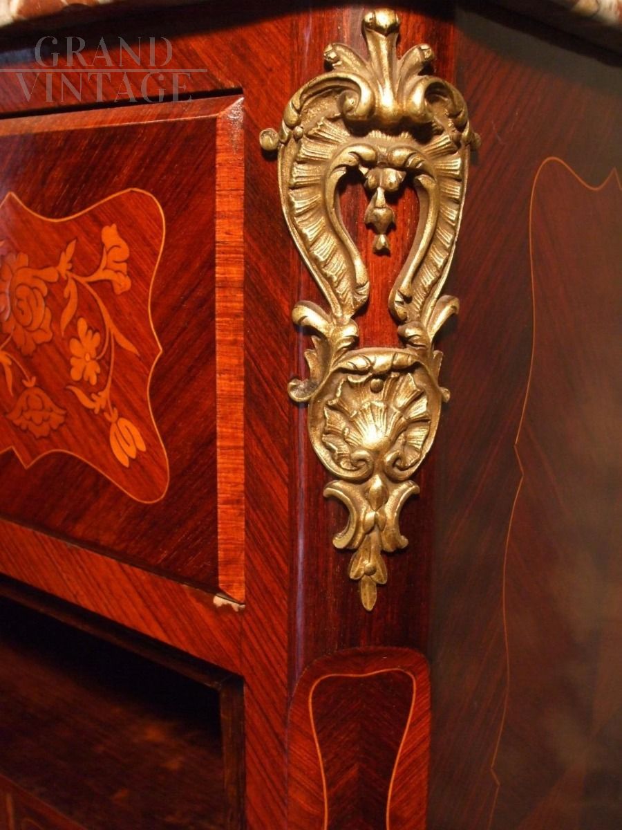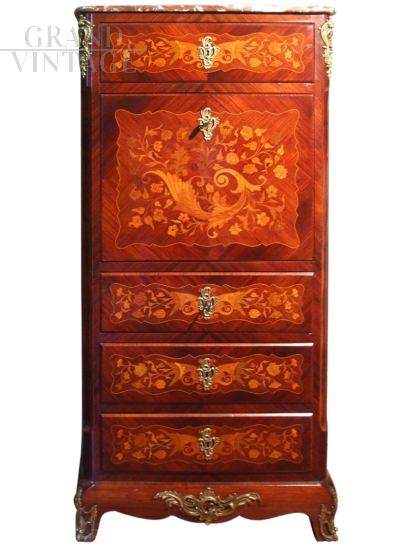 Secretaire Napoleone III con bronzi, intarsi e piano in marmo