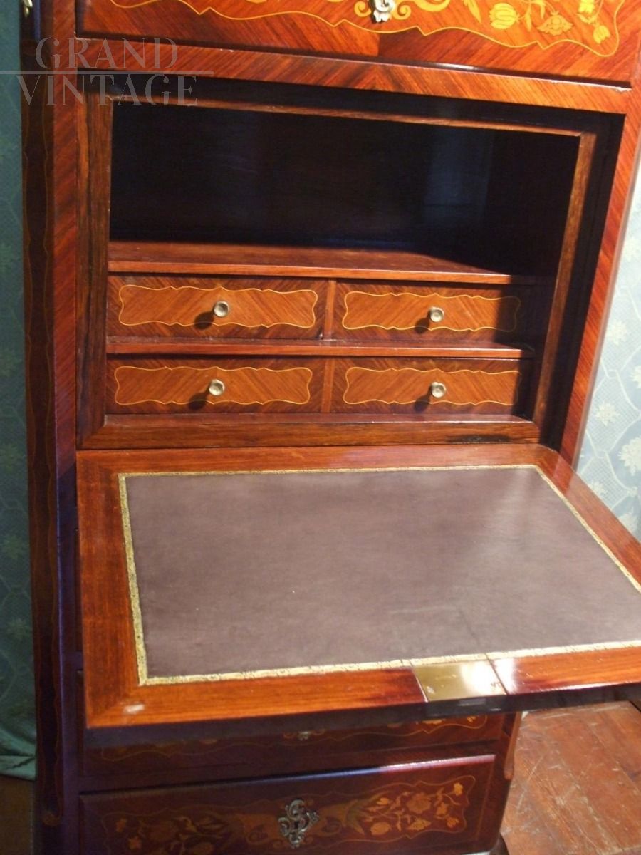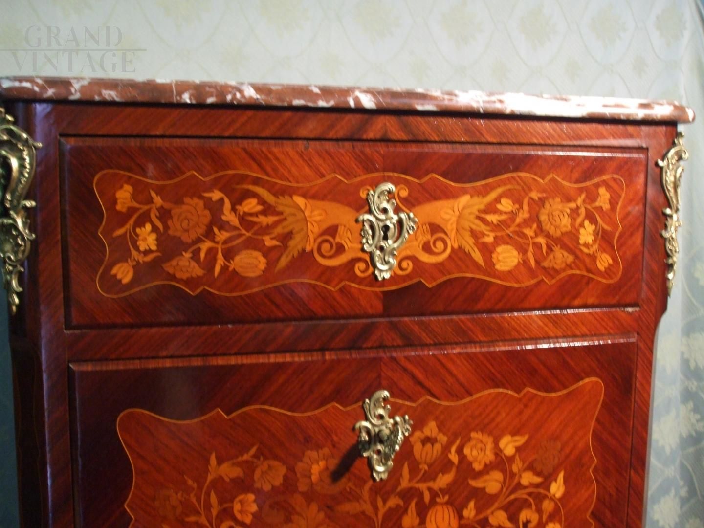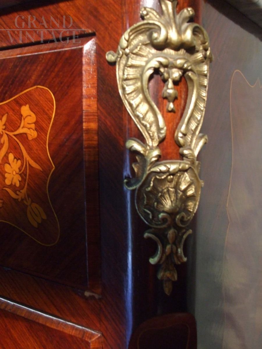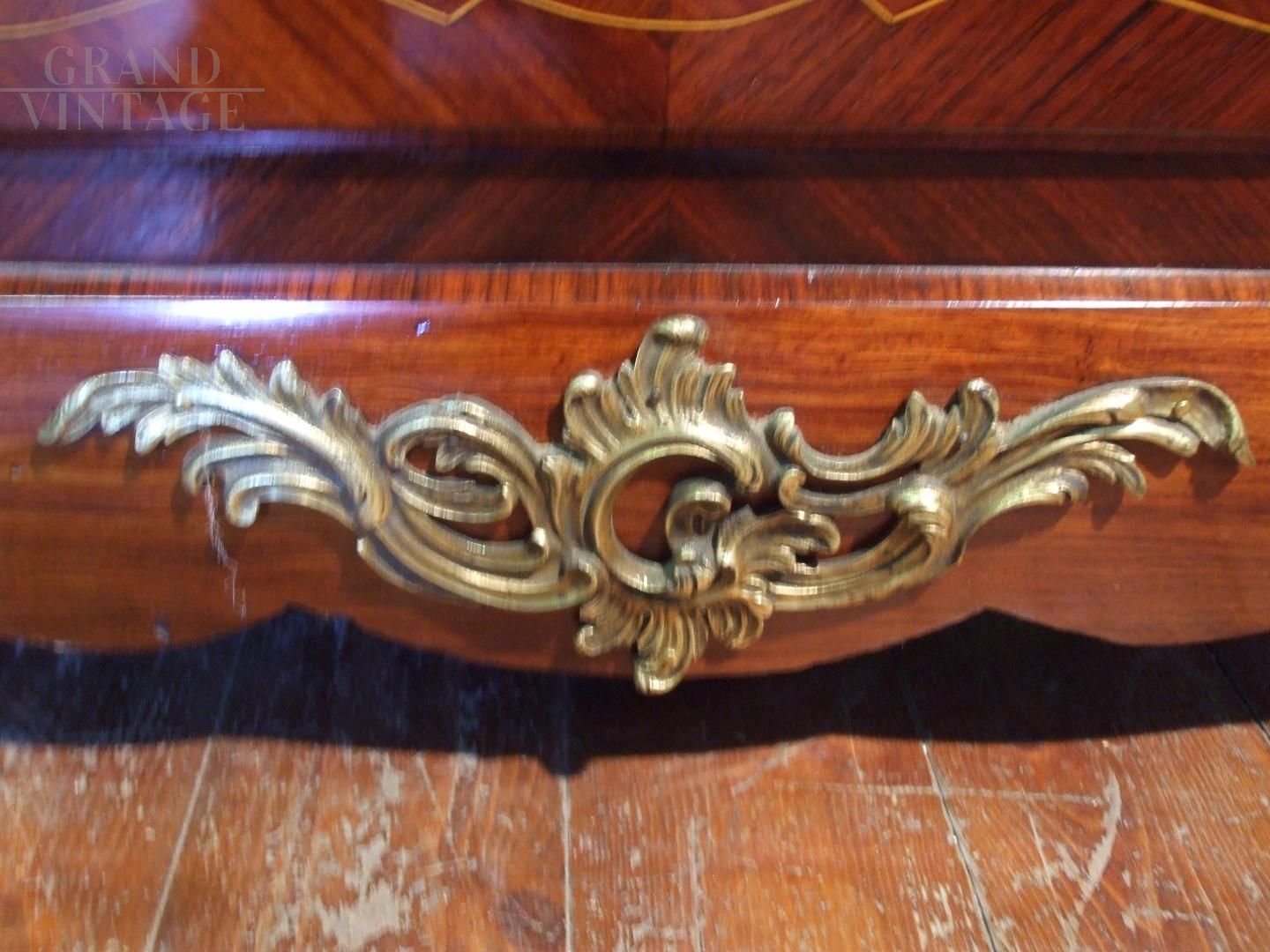 Secretaire Napoleone III con bronzi, intarsi e piano in marmo