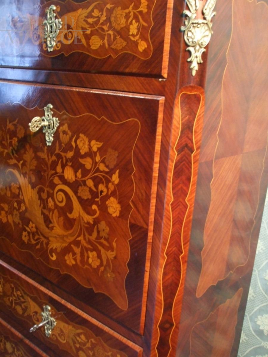 Elegant rosewood secretaire, richly inlaid with floral motifs, finished with excellent quality gilded bronzes. Particularly noteworthy are the friezes that accompany the moved form of the base, under the chest of drawers. The interior, sober and elegant, is finished with fired-gold decoration on the goatskin desk top. The upper top of the secretaire is in bevelled red France marble. The furniture is already restored.