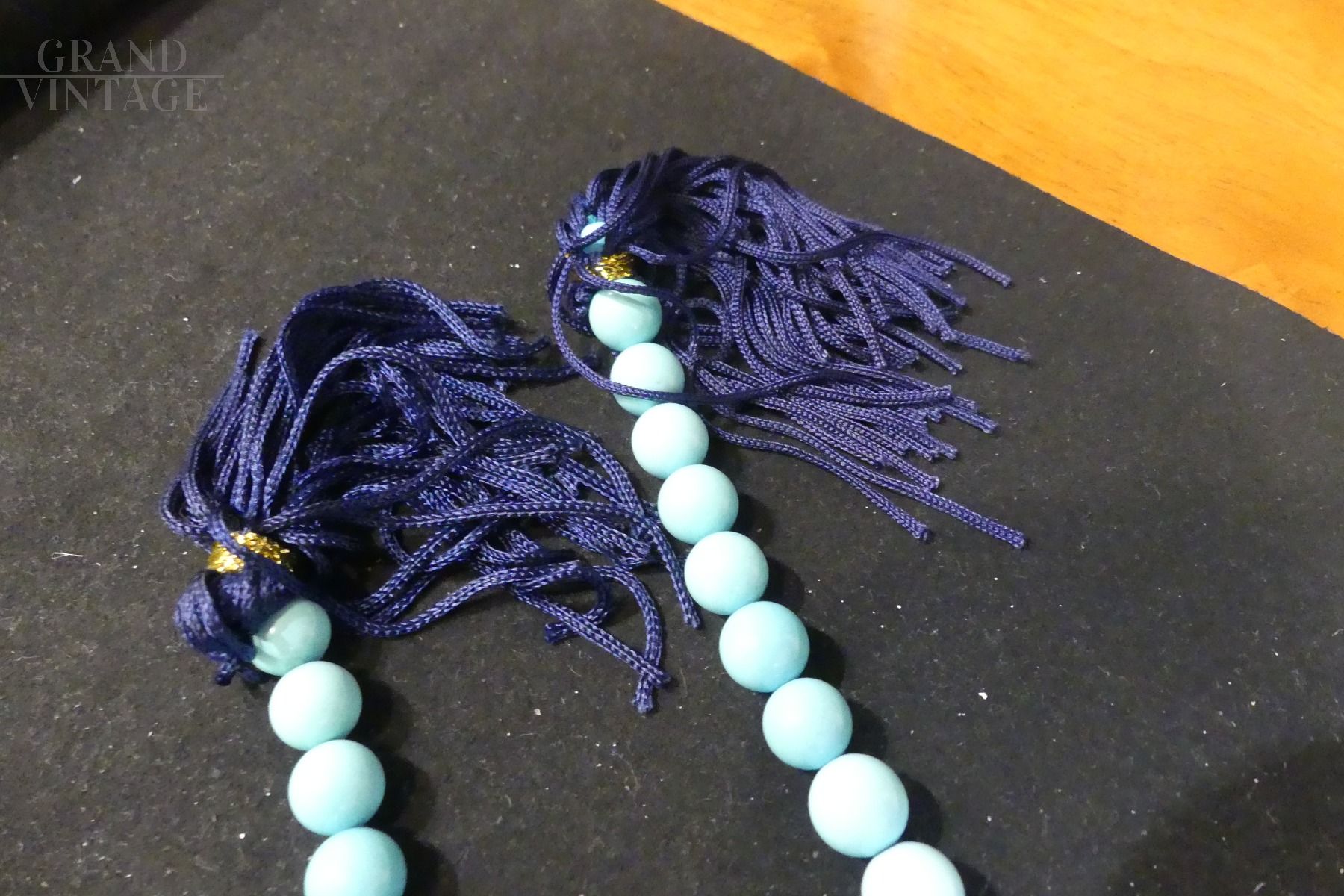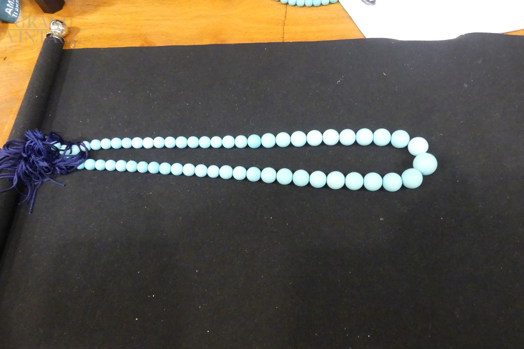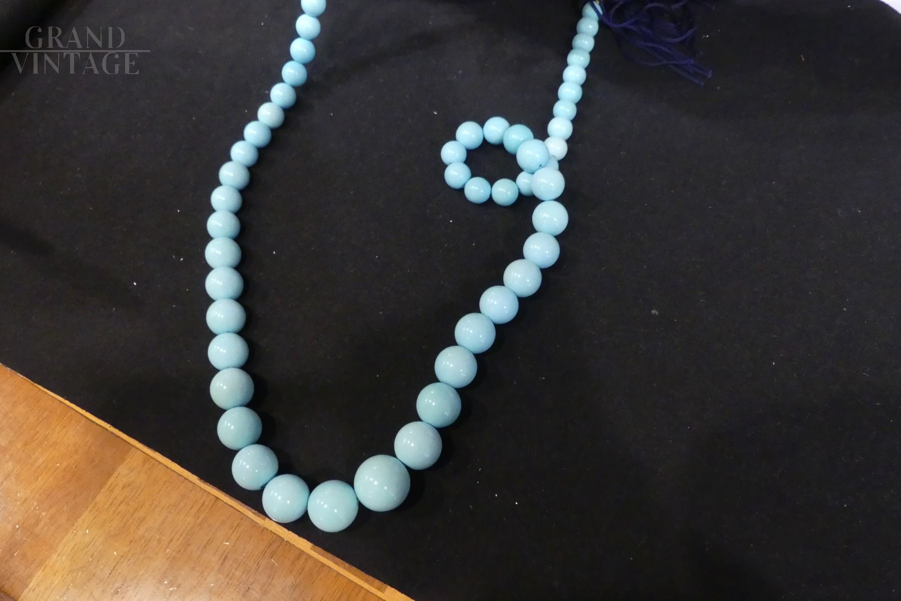 Necklace with natural degradé turquoise spheres, without clasp. The central sphere has a diameter of 17 mm, the smaller sphere has a diameter of 9 mm. Total weight 120 gr.