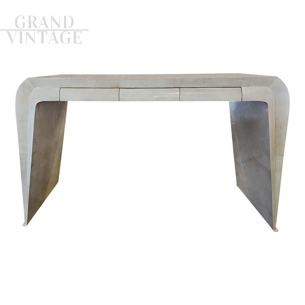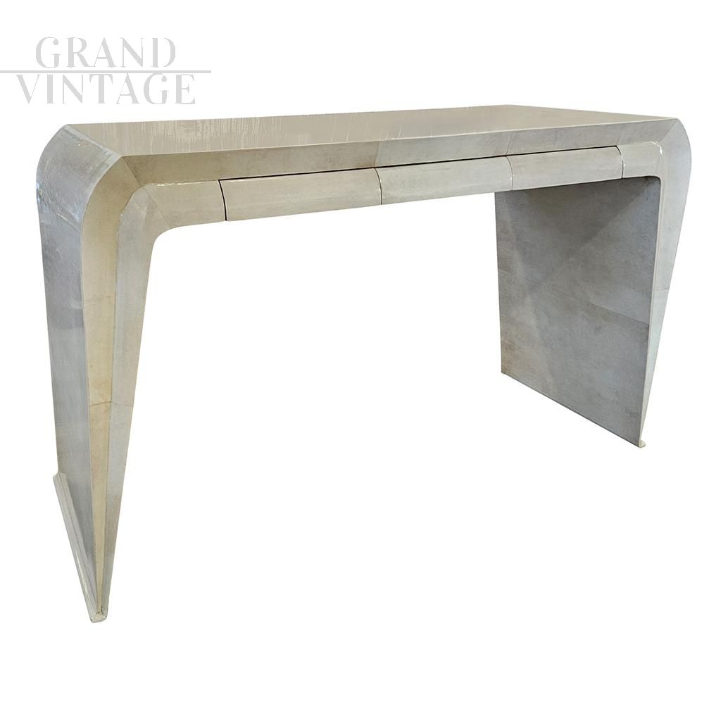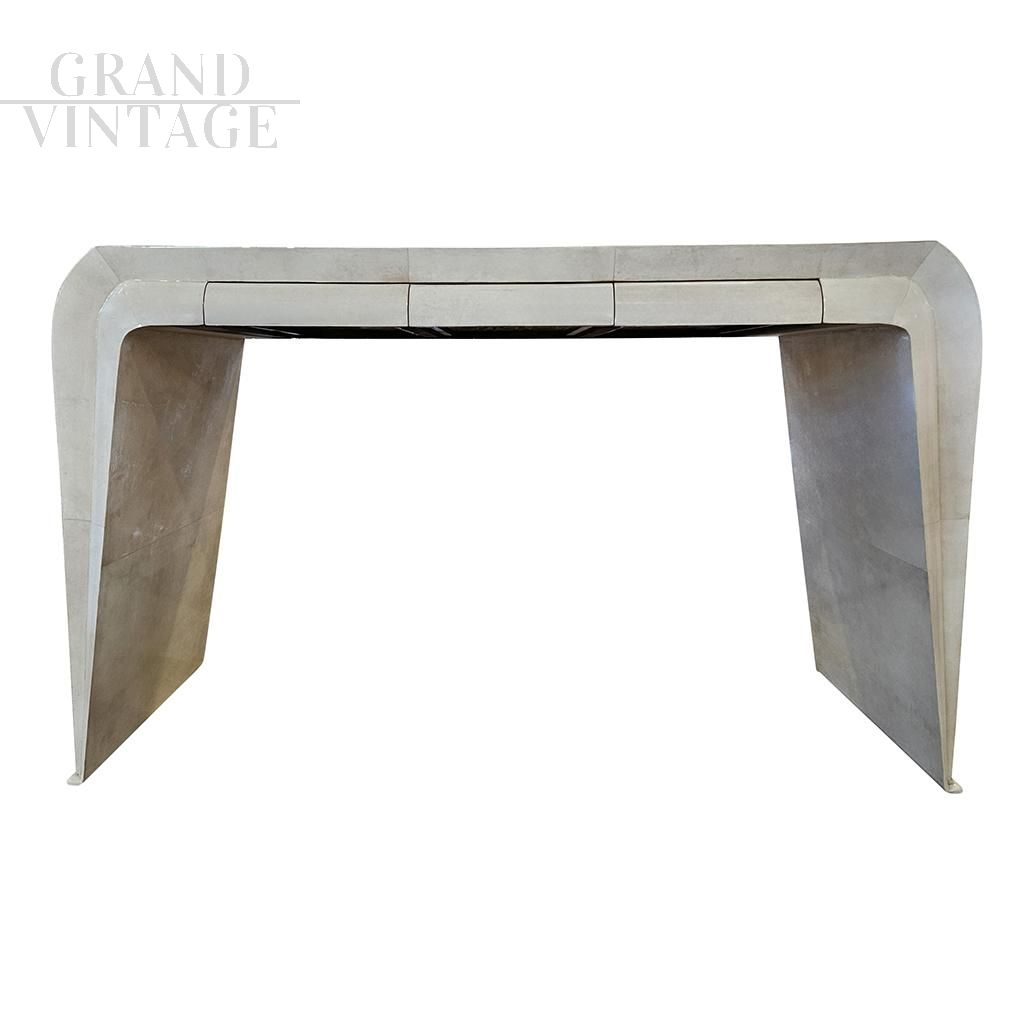 Art deco style console with beautiful wavy shapes made of wood covered in natural parchment, complete with three drawers.