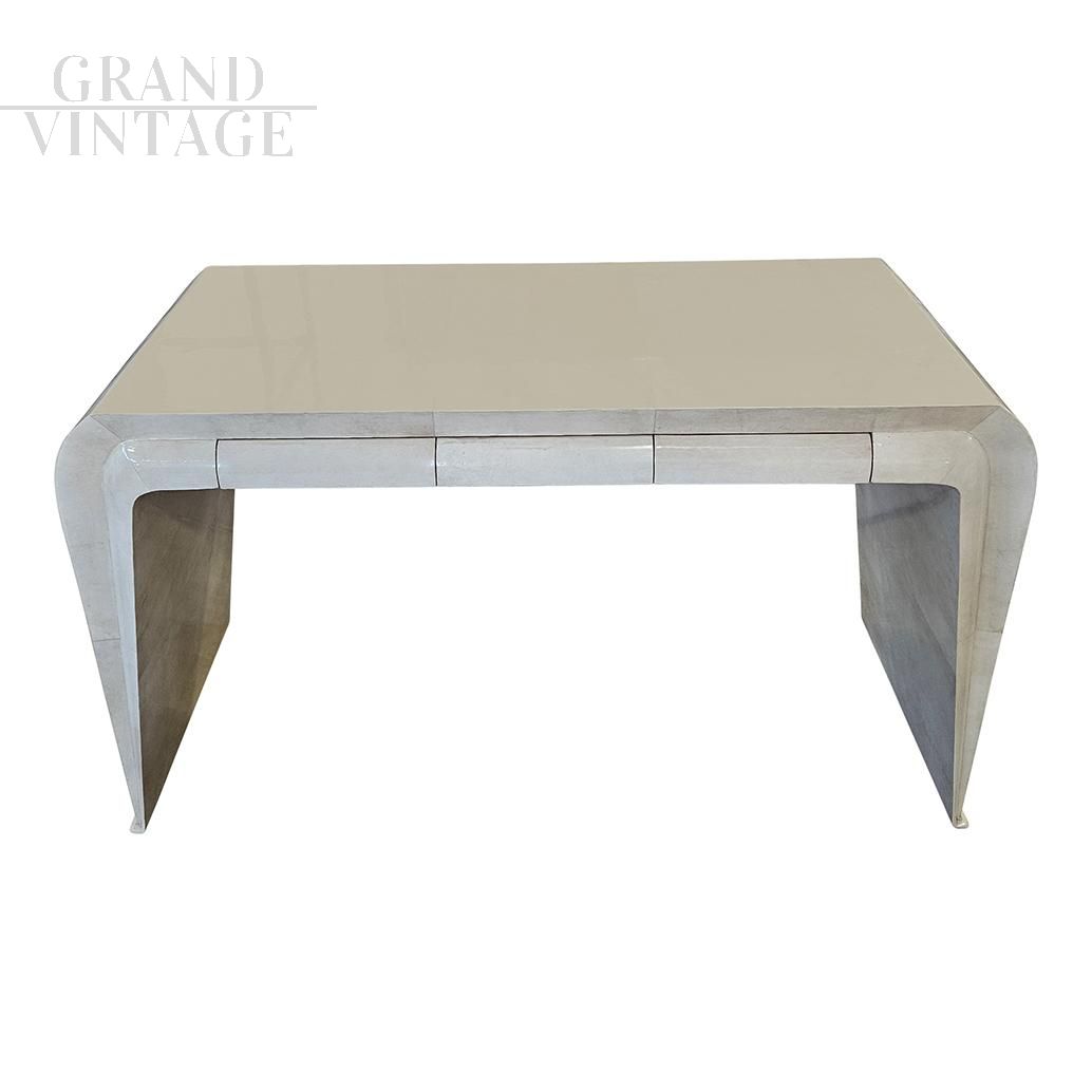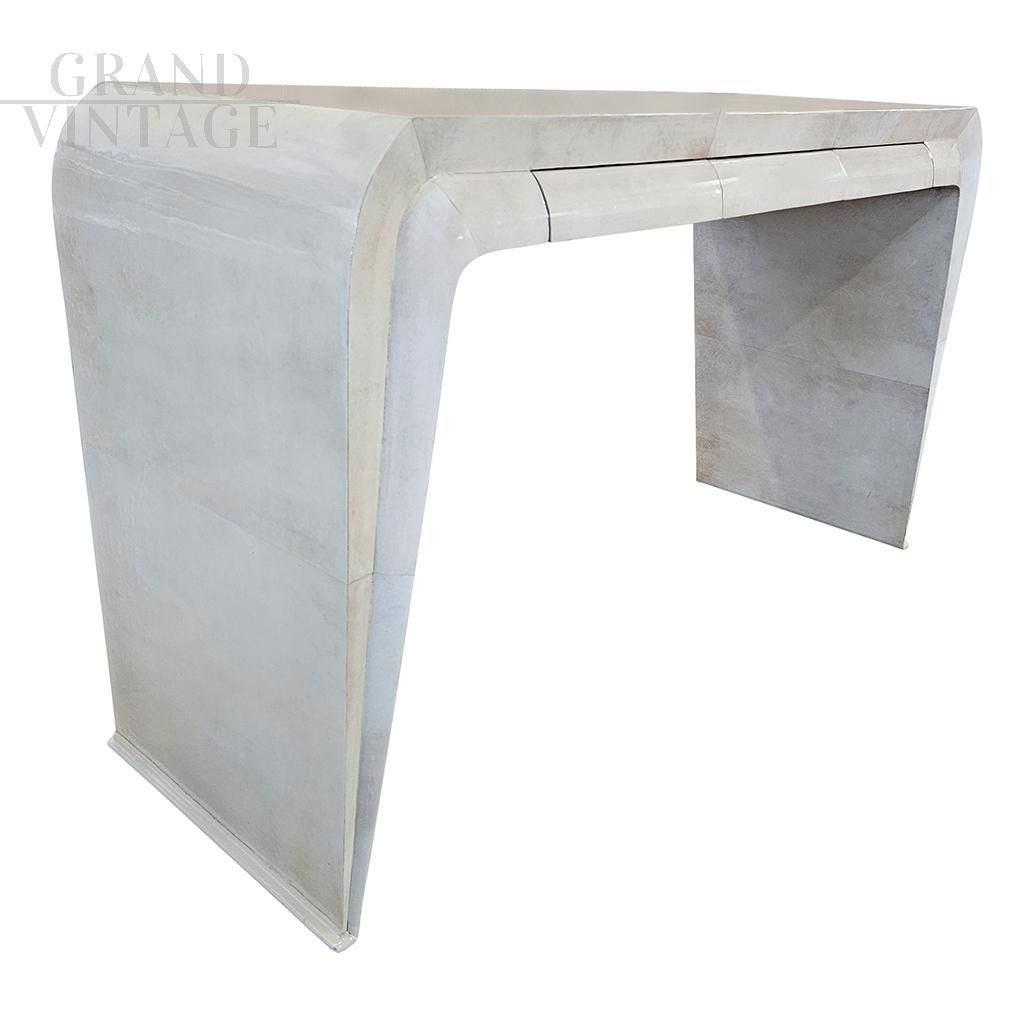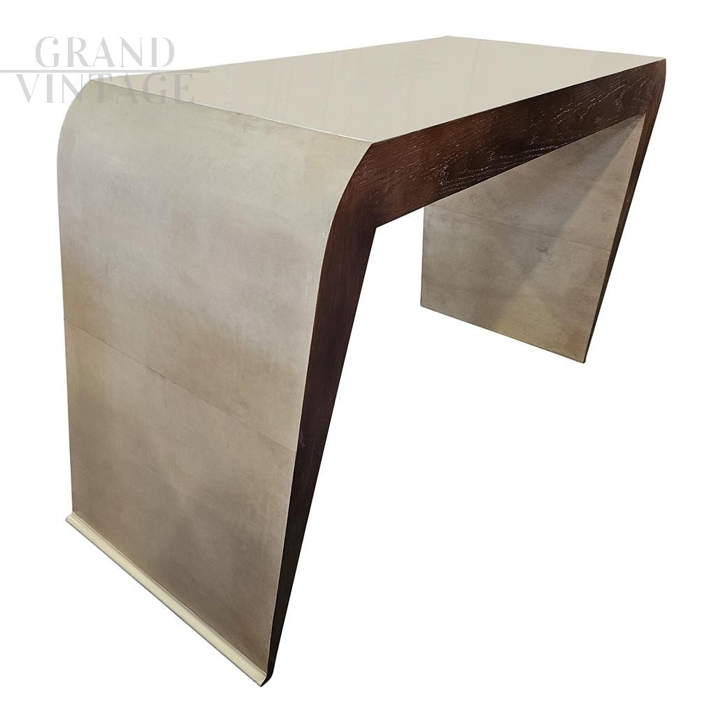 Art deco style console with beautiful wavy shapes made of wood covered in natural parchment, complete with three drawers.