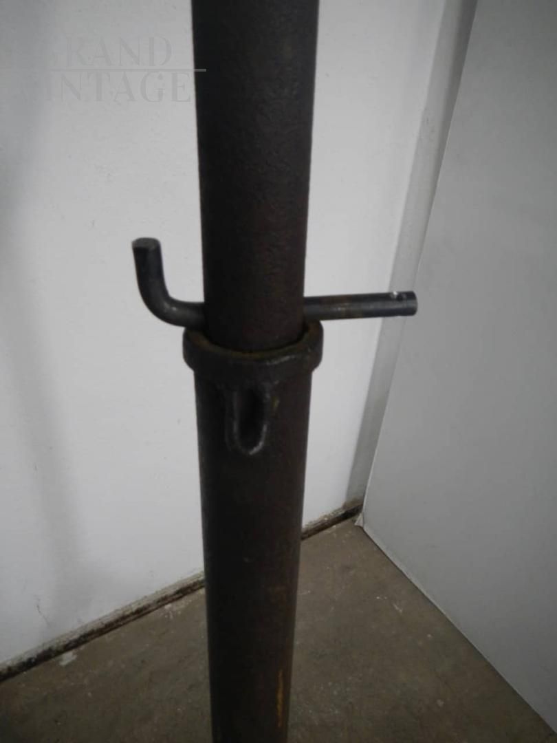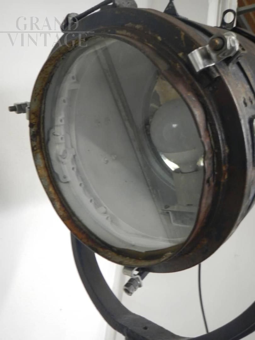 NAVY Naval Beacon - signaling searchlight, Model 95101, manufactured by Curtis Lighting Inc Chicago. The headlight is mounted on an iron stand, is functional and re-rewired, and has a beautiful patina with its original blue lacquer. The height is adjustable from 170 to 220 cm.