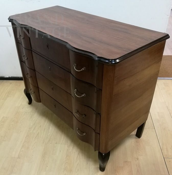 Dresser of drawers from the first half of the 1900s in neo-baroque style with shaped front equipped with 4 drawers, made of flamed walnut veneered wood with shaped feet. Shaped platform with ebonized edge. The piece of furniture has been restored and is in excellent state of conservation, with shellac and wax finishes.