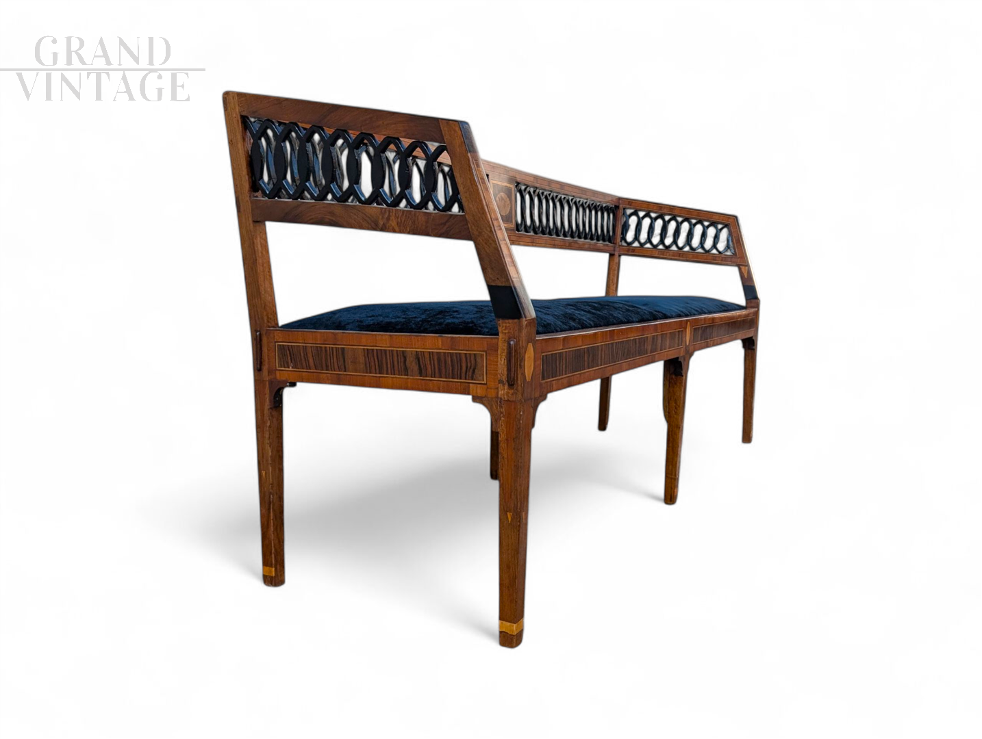 A refined indoor bench crafted from walnut, embellished with elegant maple inlays that emphasize its profile and enhance the structure with geometric and decorative details. The backrest features a visually striking ornamental perforation, composed of a sculpted woven motif, lending lightness and movement to the design. At the center of the backrest is an inlaid reserve with a burl medallion motif, a symbol of quality and craftsmanship. The padded seat, upholstered in midnight blue velvet, offers elegant and understated comfort, perfectly in tune with the refinement of the entire structure. The straight legs, also embellished with maple trim, lend solidity and elegance to the piece.