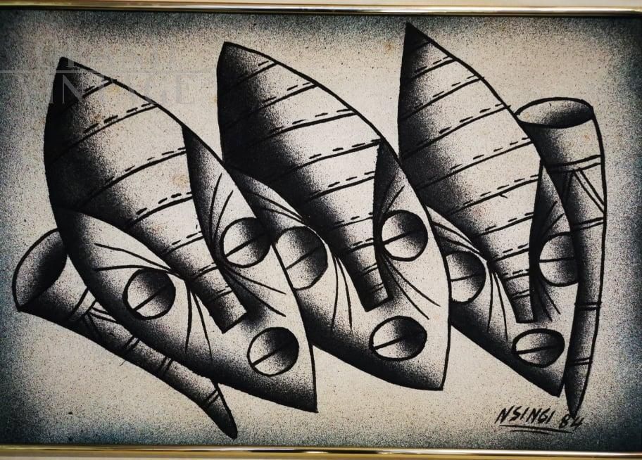 Painting by Nsingi oil on panel depicting tribal masks, Zaire (now Democratic Republic of the Congo) 1984.
