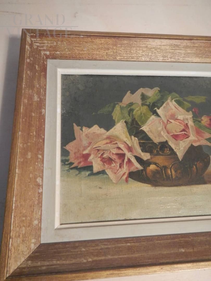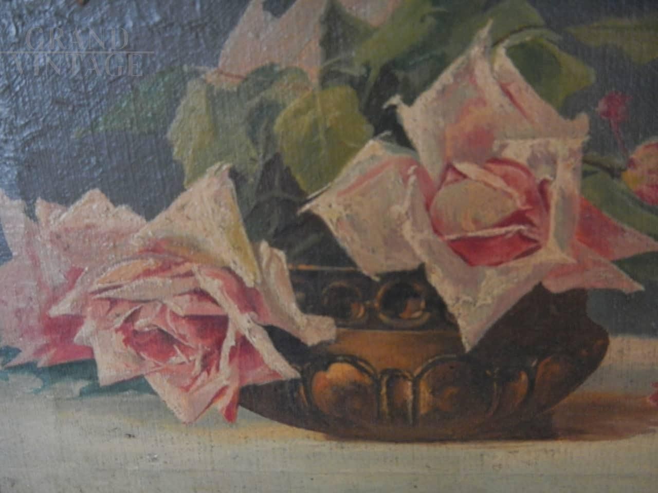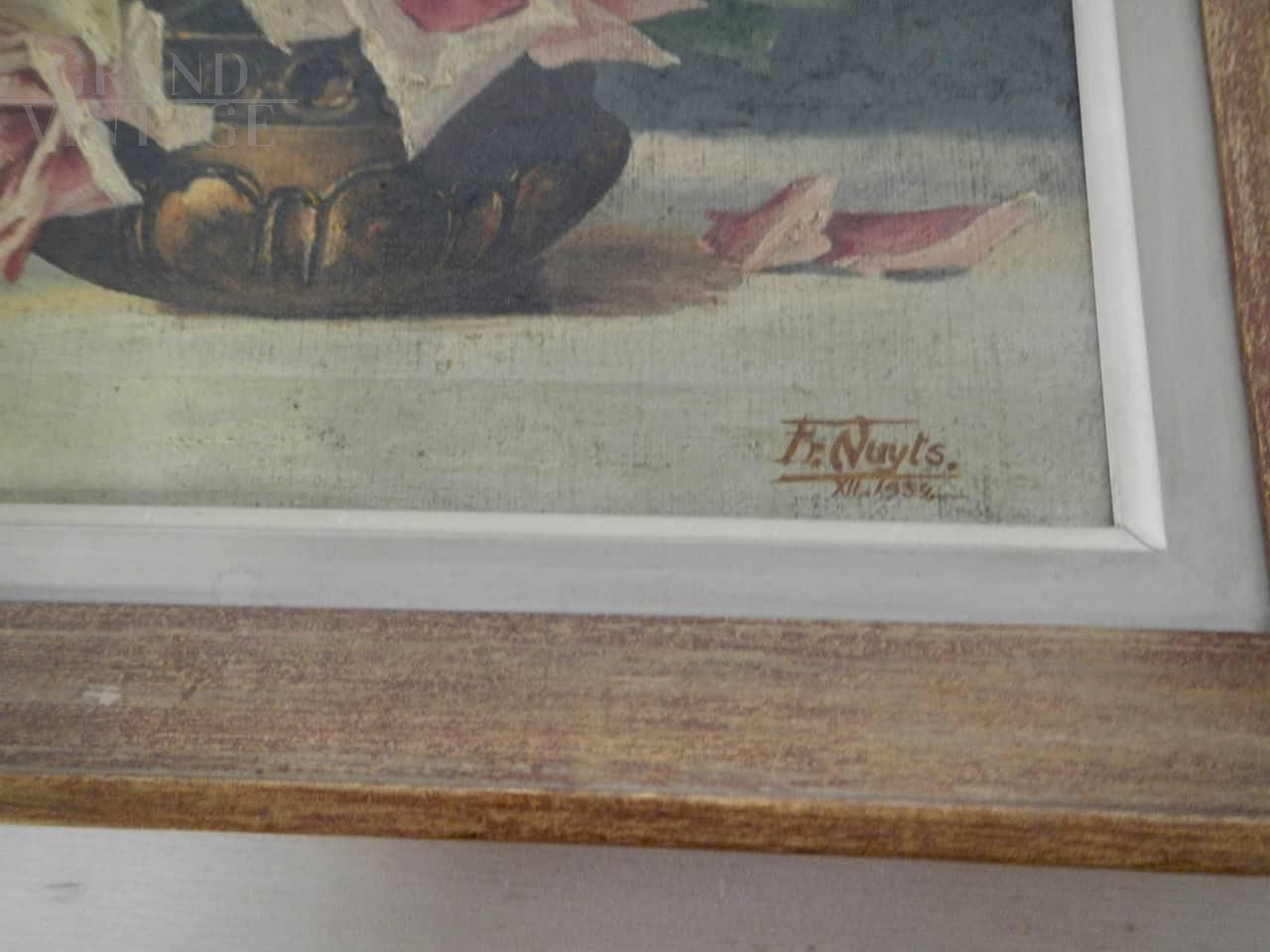 Belgian oil painting on canvas with vase of pink roses, signed Nuyts on the front, complete with fir wood frame. In good condition, it has been restored in Liège.
