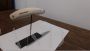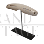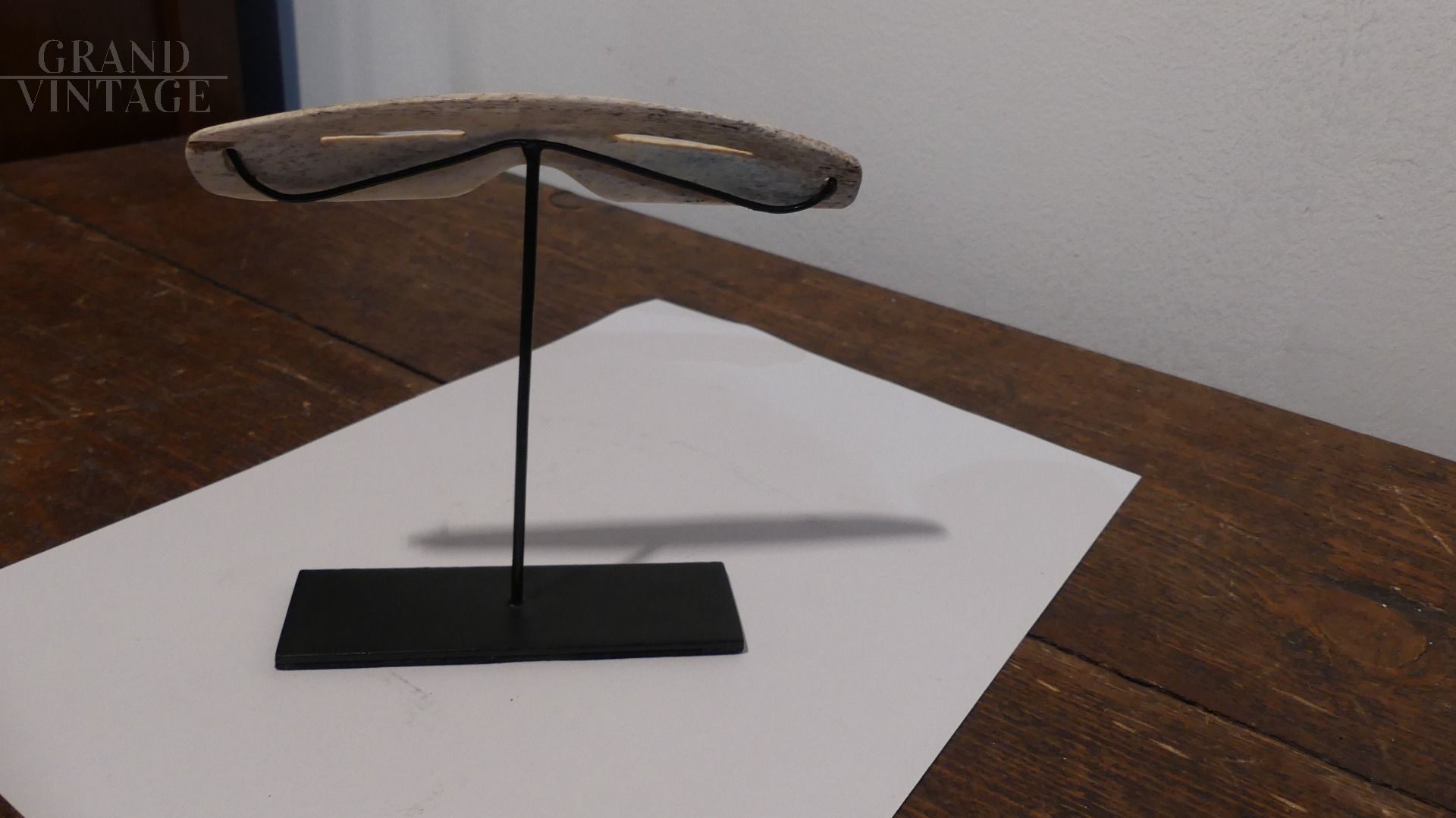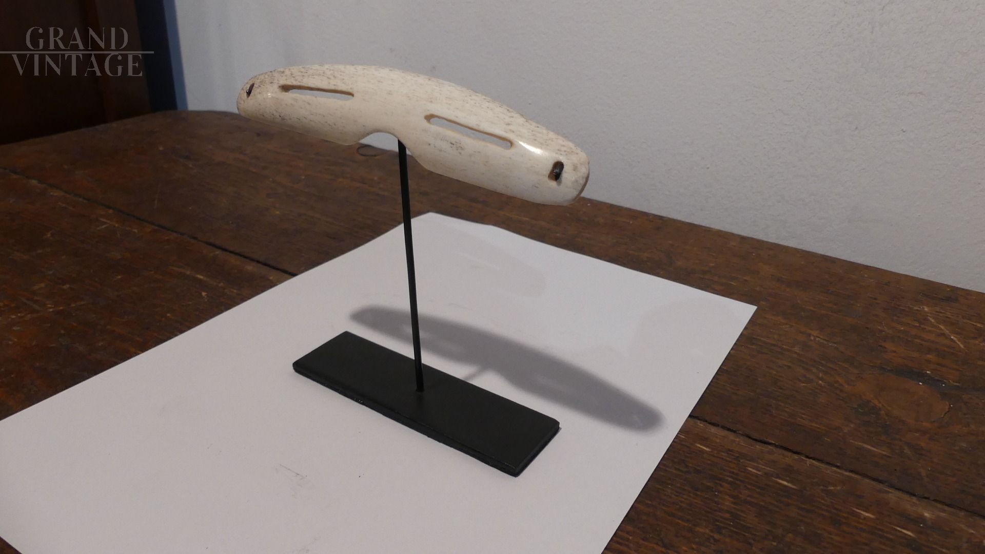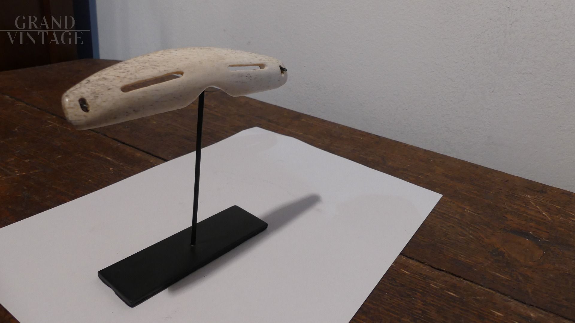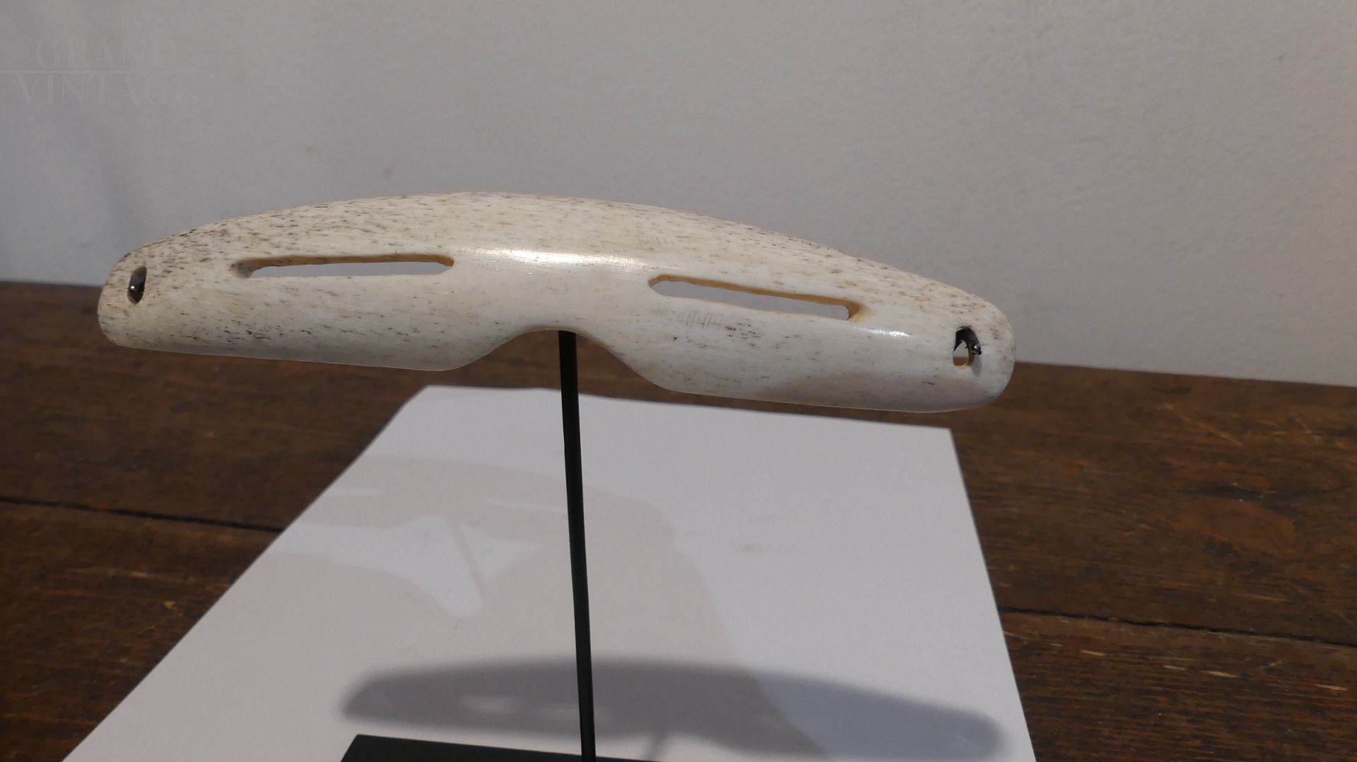 Inuit carved bone goggles protecting from sun and snow, with metal stand.