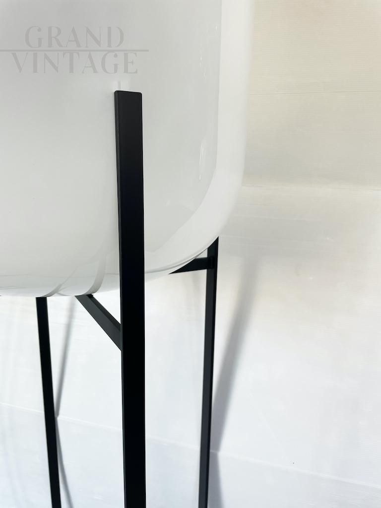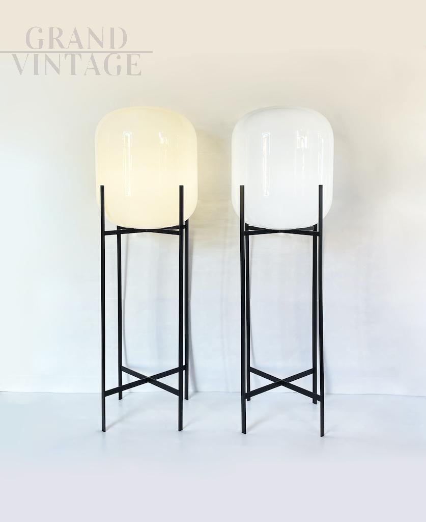 Special contemporary floor lamp in Oda style for Pulpo by Studio Sebastian Herkner from 2014, featuring a luminous globe in fine white blown glass and a simple and elegant metal structure that balances the large “head” above. The design is inspired by the fantastic photos of water towers taken by German photographers Bernd and Hilla Becher. Available as a pair, price is for each.
