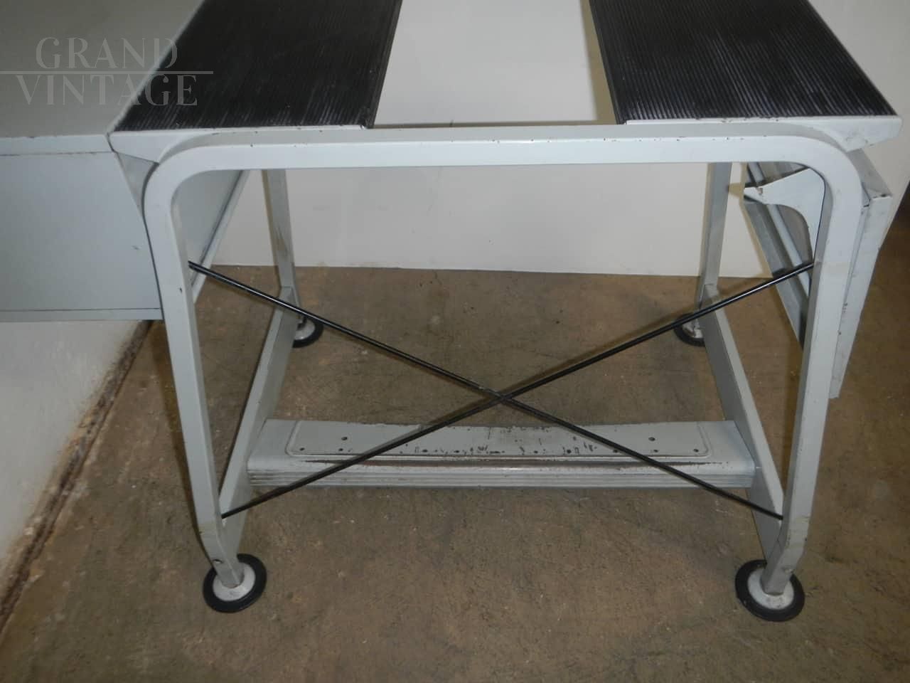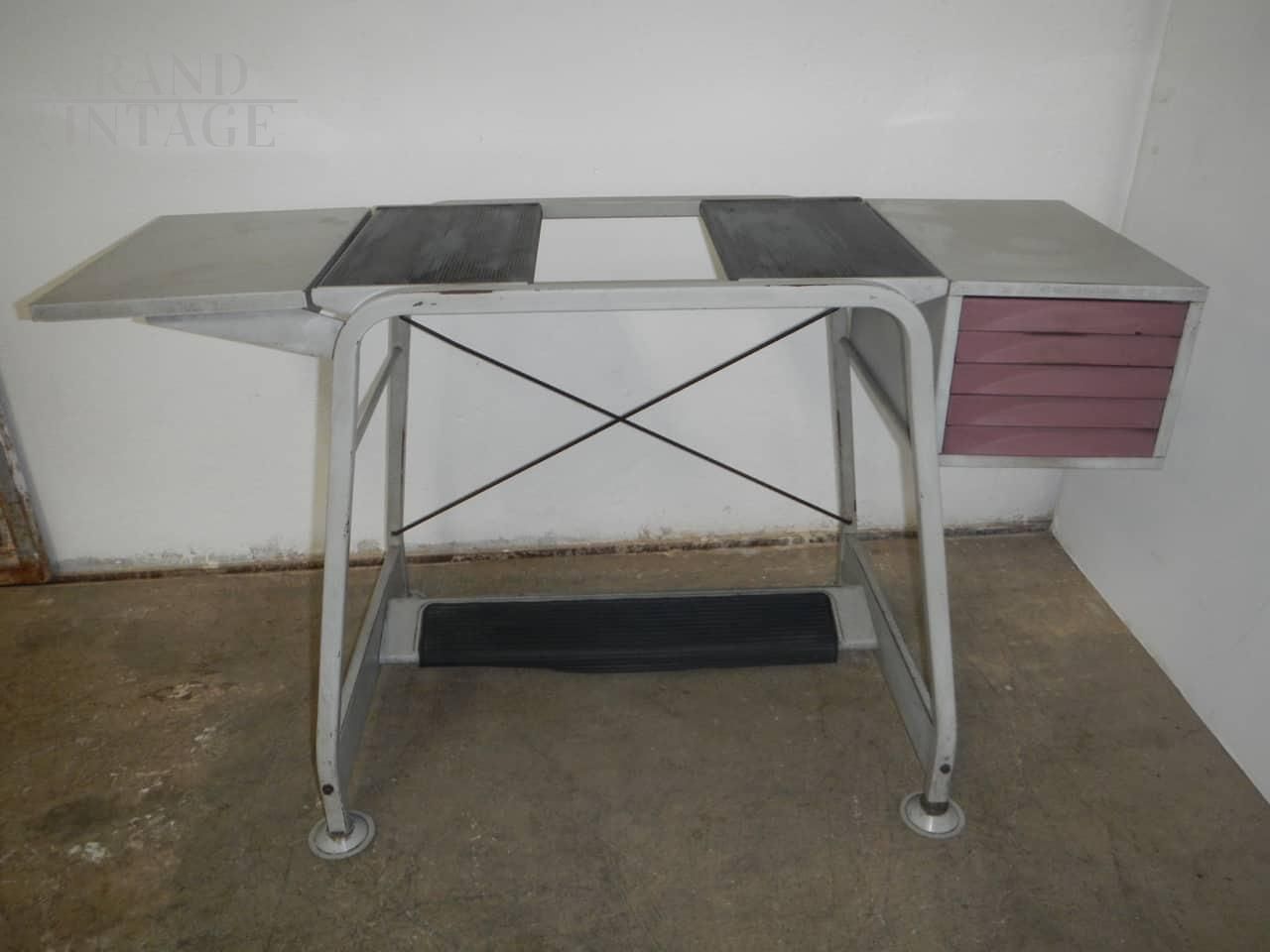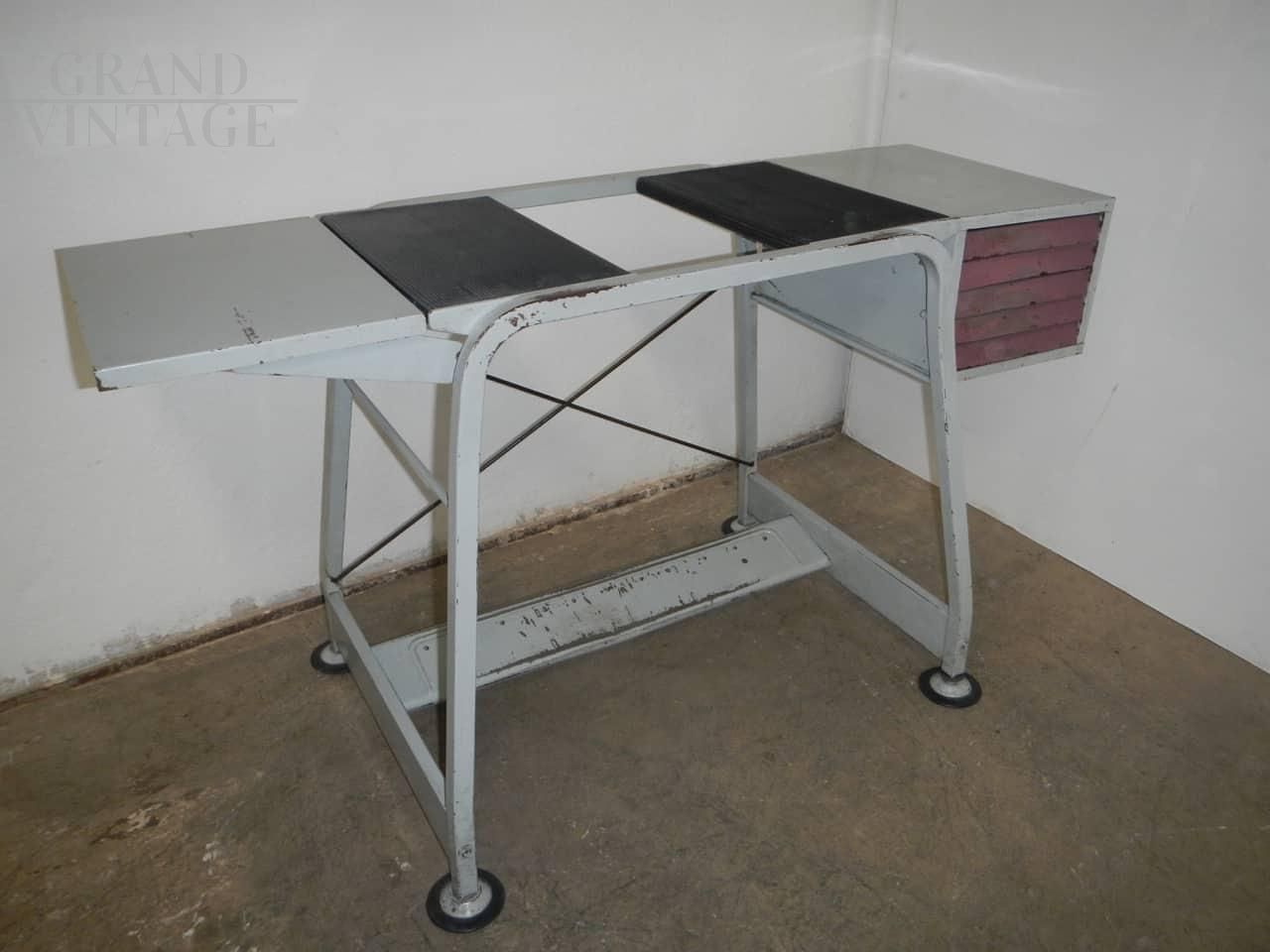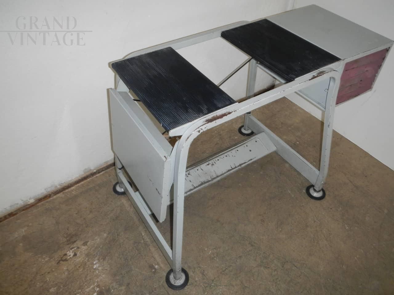 Olivetti industrial typing desk, made of metal, with chest of drawers and adjustable foot, 1970s.
