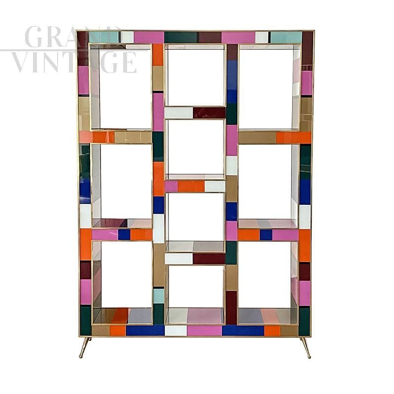 Wooden bookcase covered in glass in Mondrian style. The bookcase is a centerpiece, double-sided, and can be placed in the center of the room as a divider. Complete with brass profiles and feet.
