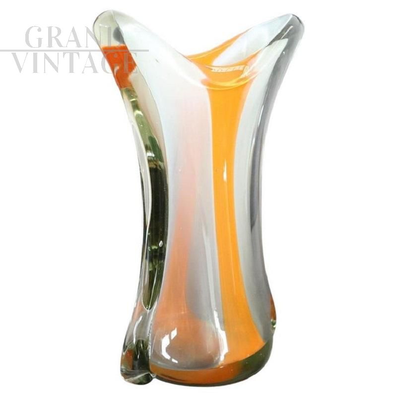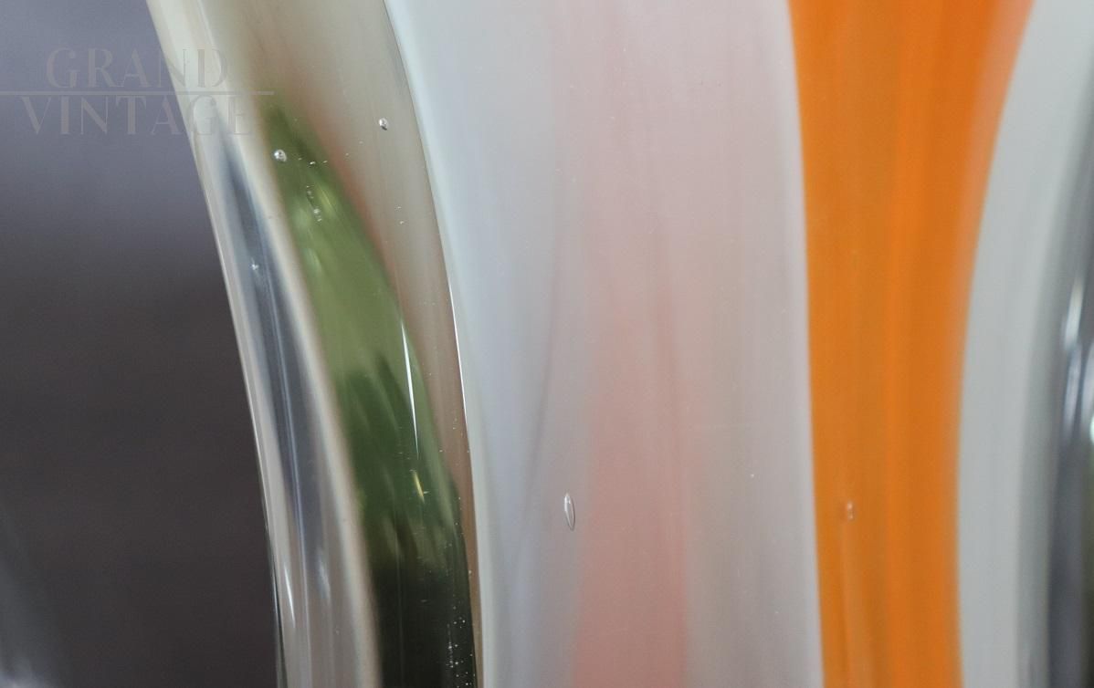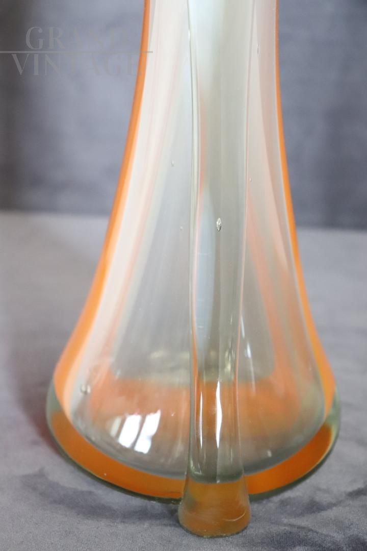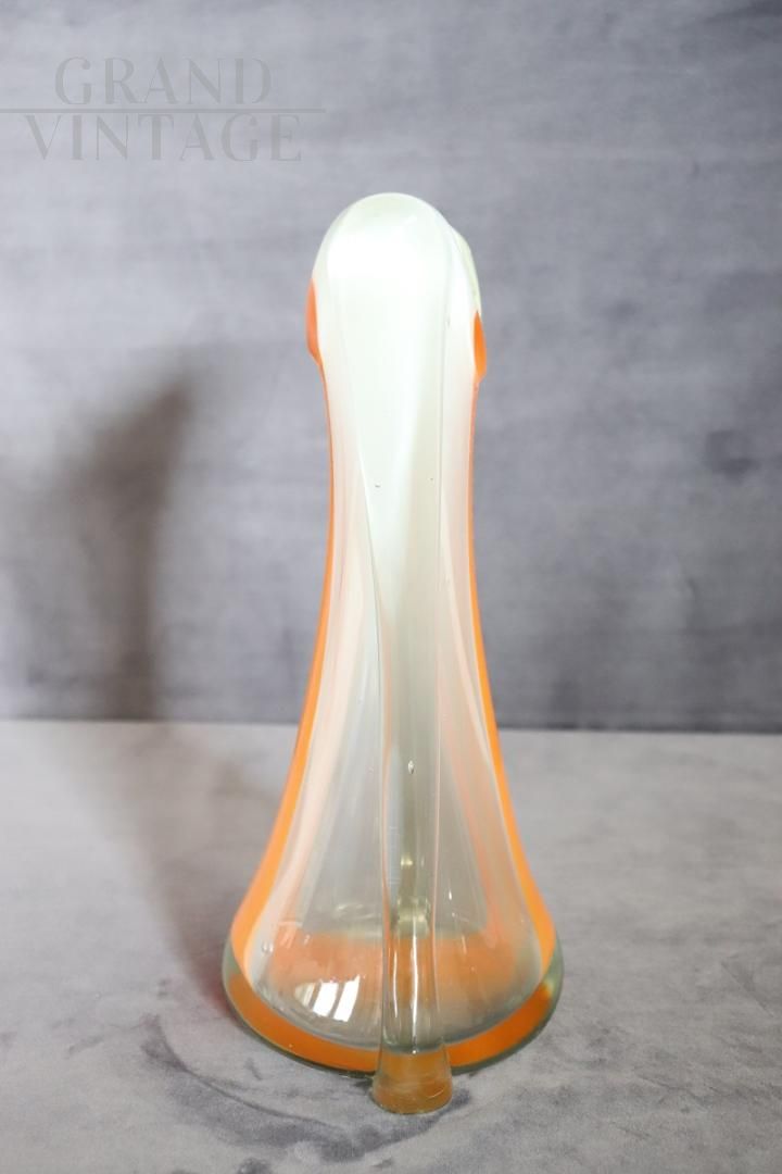 This 1960s Murano vase is truly a masterpiece that embodies the excellence of Italian glass-blowing craftsmanship. The presence of small bubbles in the glass not only testifies to its authenticity, but also to the craftsmanship. The color transition, which fades from a transparent base to bright shades of white and orange, creates a dynamic and fascinating visual effect, making the vase an element of great visual impact. The colors, chosen with care and skill, instill vitality and character, allowing the vase to integrate perfectly into a variety of furnishing styles, from modern to classic. We are open to price negotiations.