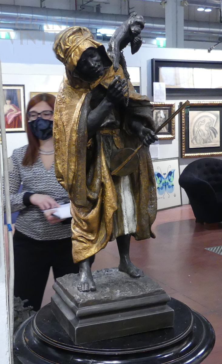 Original Russeau signed sculpture, depicting a Middle Eastern beggar with a monkey on his shoulder and a stringed instrument in his hand, in bronze with magnificent golden details.
