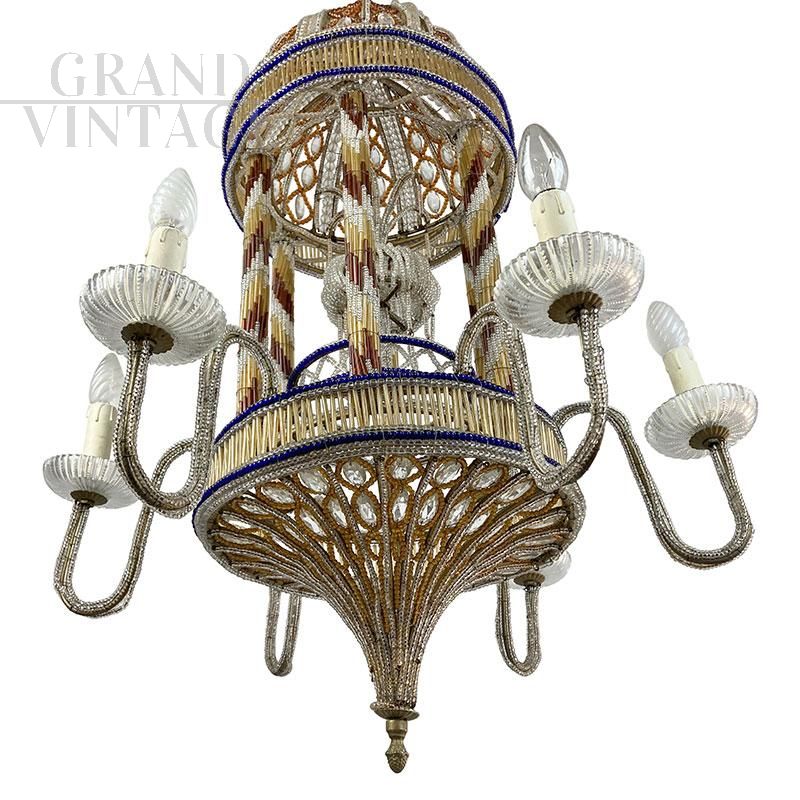 Beautiful oriental style lantern chandelier in metal covered with glass beads of various shapes and colours, with pavilion-shaped structure composed of metal uprights with S-shaped arms that extend from the balustrade and end with fluted glass gutters. In the center of the pavilion a fountain. The chandelier is made up of 6 light points with connections for E14 type bulbs.