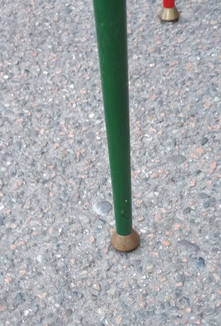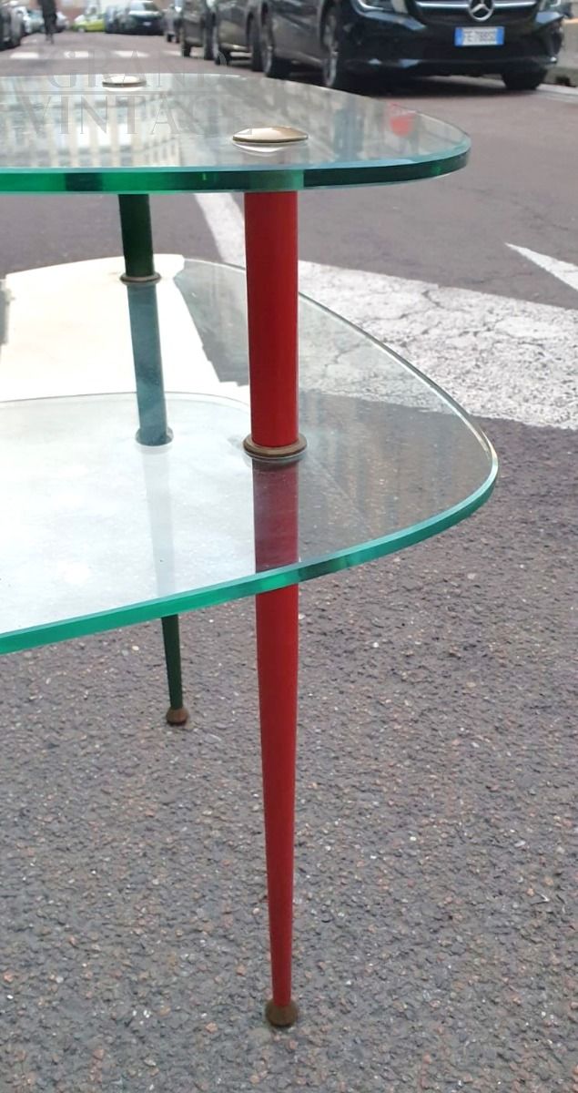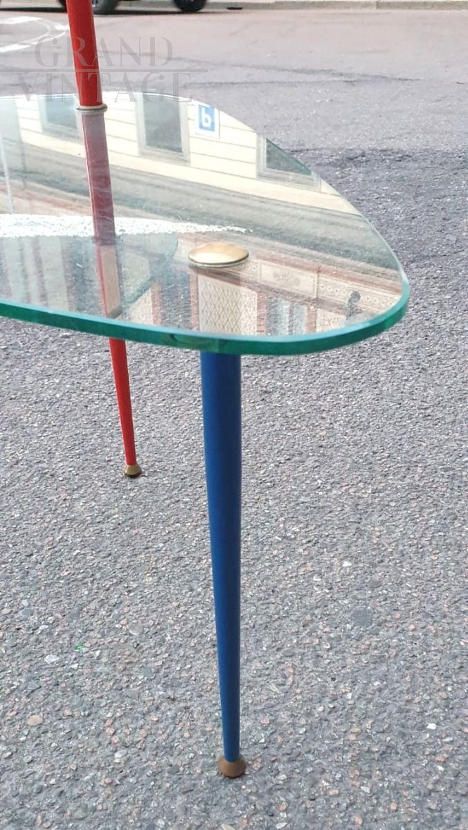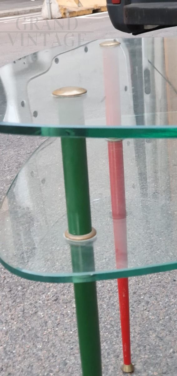 Beautiful Harlequin design coffee table by Edoardo Paoli for Vitrex with two kidney-shaped tempered glass tops and four metal legs painted in different colours: red, yellow, green and blue, with brass details. Produced in the 1960s, the coffee table is in excellent condition, the glass tops show various signs of aging as shown in the photos. The Vitrex signature is present, to guarantee authenticity. Each top measures approximately 65 x 54 cm.