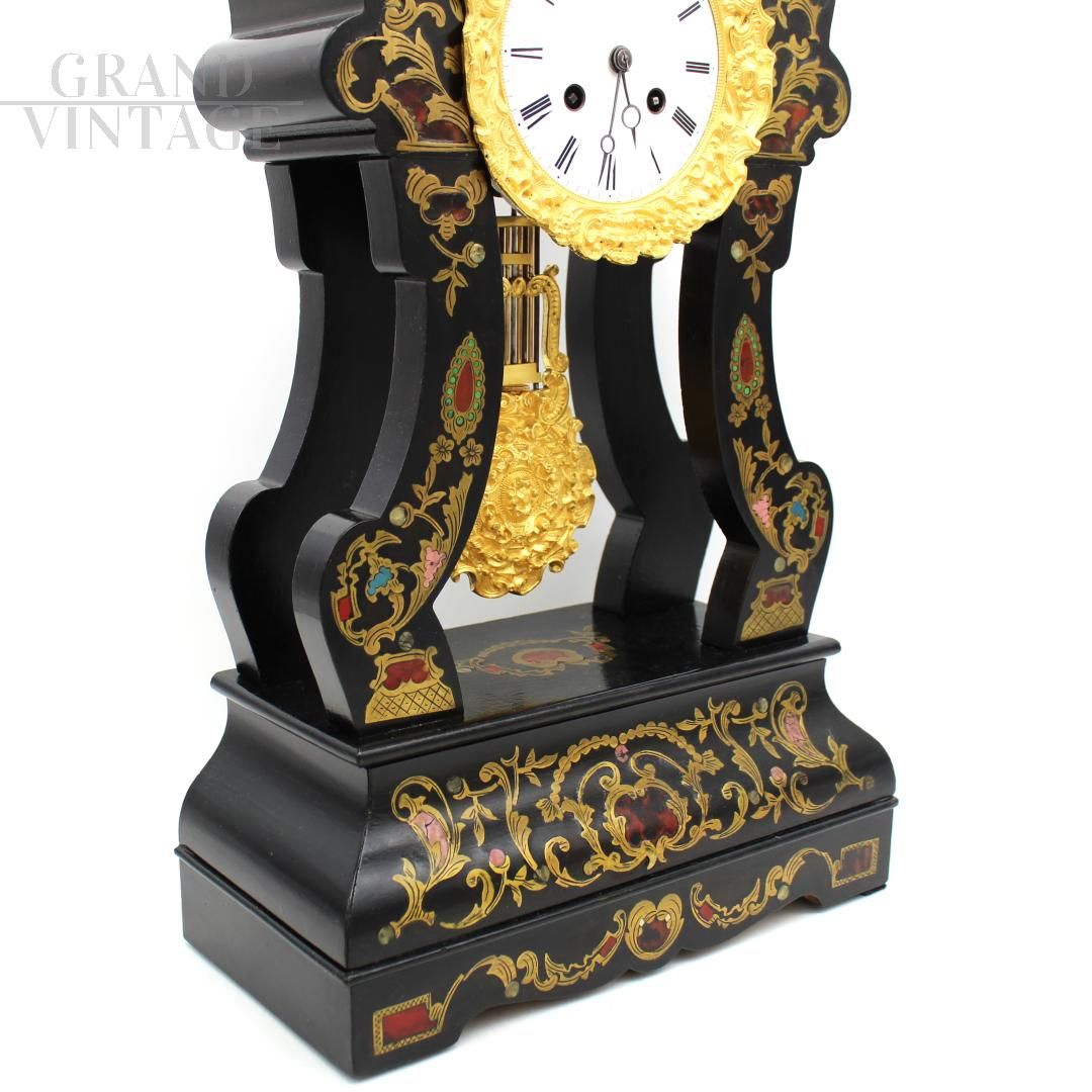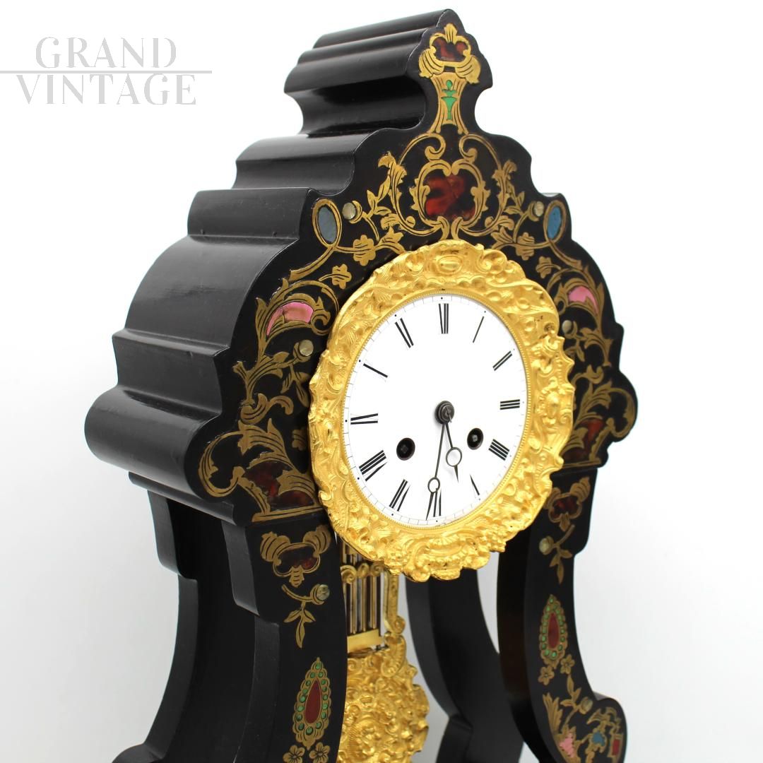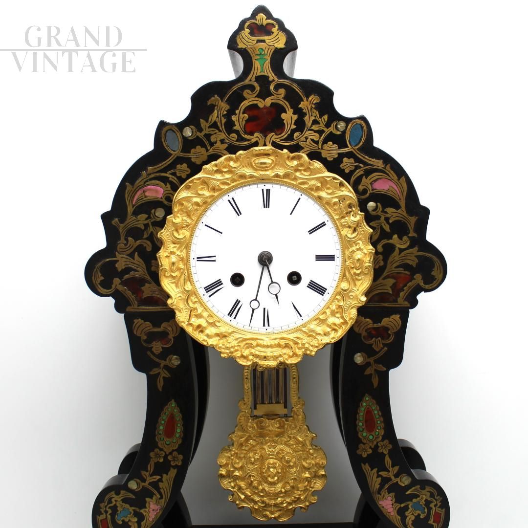 Napoleon III antique pendulum mantel clock in ebonized wood, inlaid and threaded in brass and mother of pearl, complete with gilded bronzes.