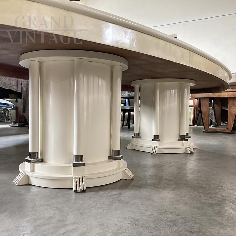Oval art deco style table with wooden structure covered in parchment with artistic leaf motif decoration on the top.