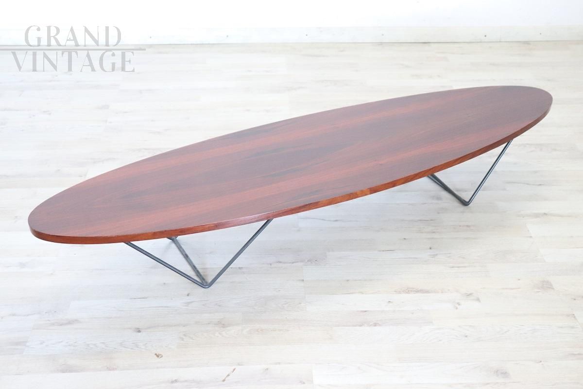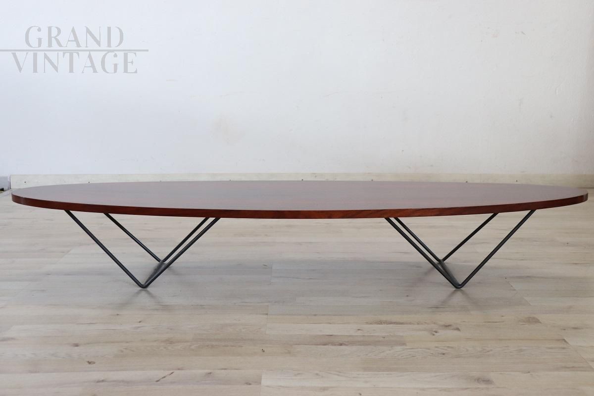 This refined mid-century coffee table is a beautiful representation of 1960s Italian design. Crafted from rich rosewood veneer, it features an elongated oval shape that exudes elegance, supported by minimalist metal legs that add a touch of contemporaneity. While reflecting the signature style of renowned designer Augusto Bozzi for Saporiti, this piece stands alone, without labels or brands, allowing its unique character to shine through. Price negotiable, excellent condition.