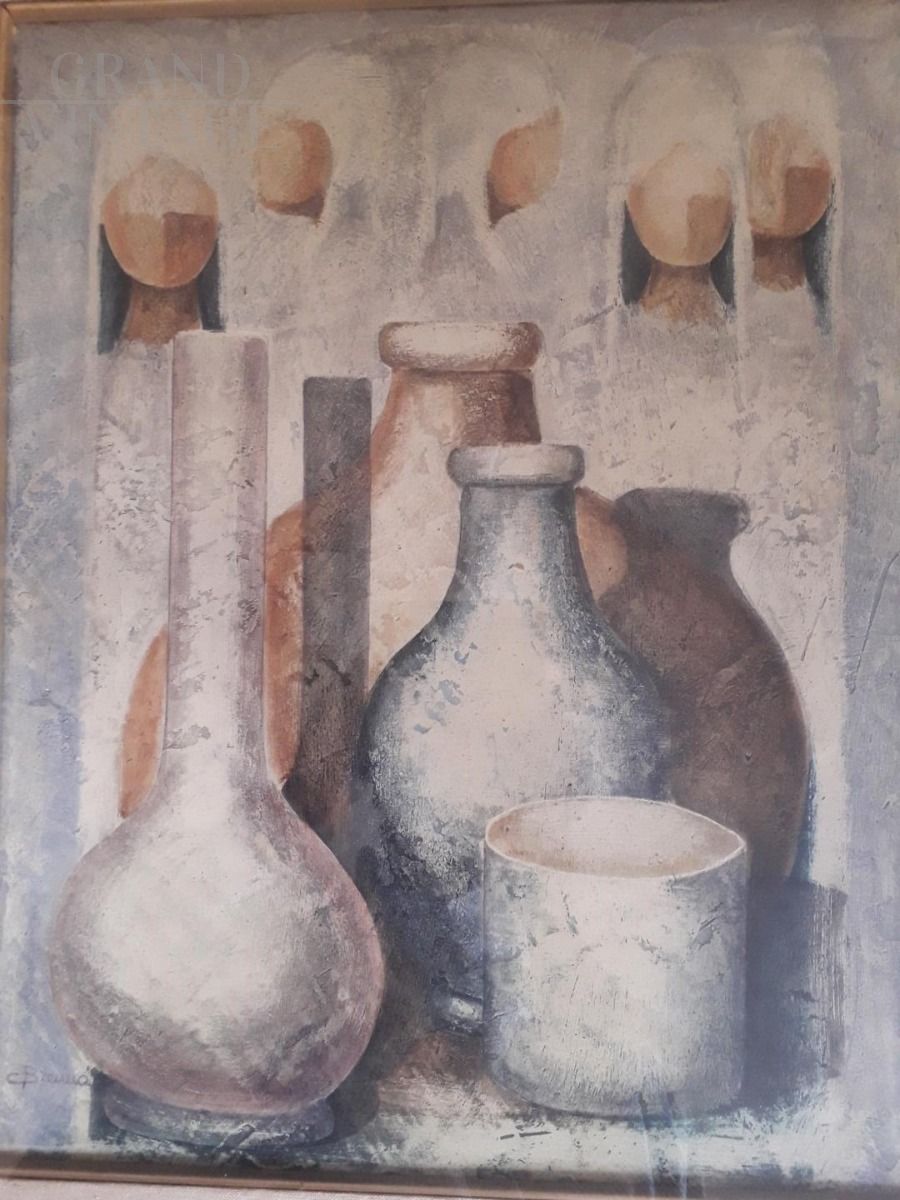 Oil painting on canvas from 1974 by Carlo Brenna, painter and sculptor born in Italy in 1935, of surrealist and metaphysical inspiration.