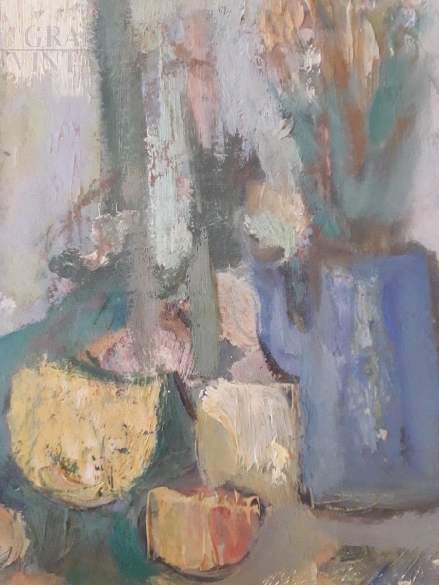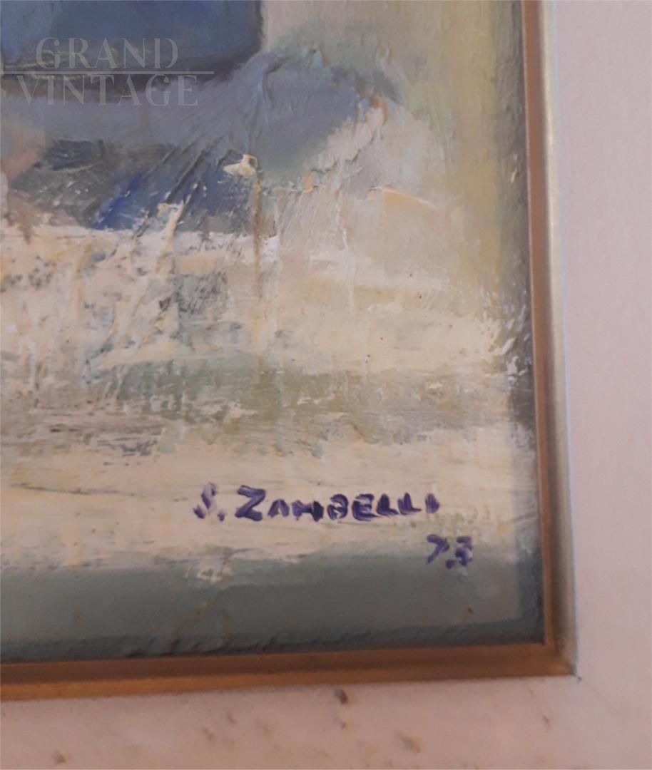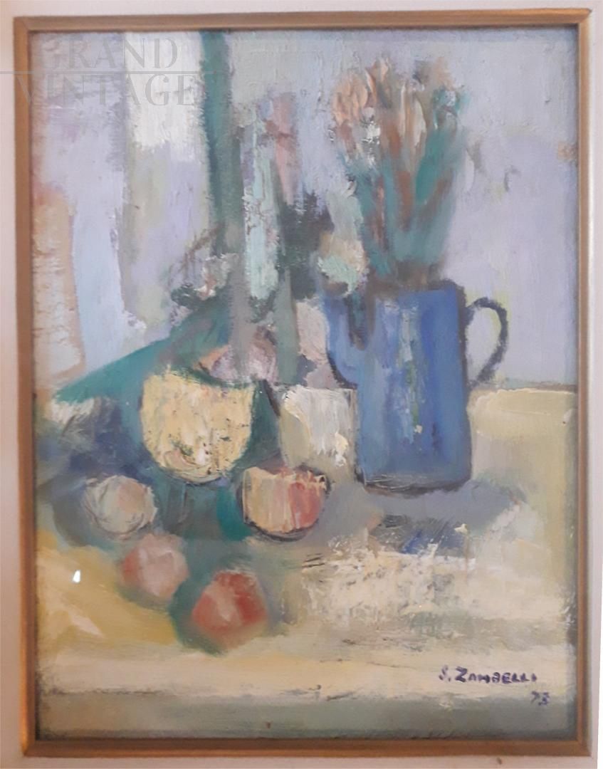 Painting by Sergio Zambelli with abstract still life, oil on canvas, signed and dated 1972.