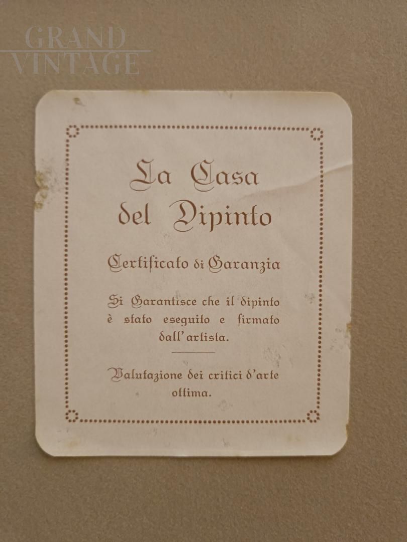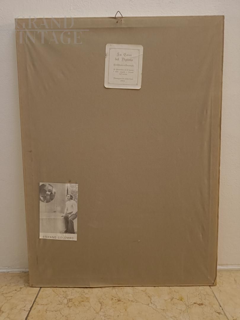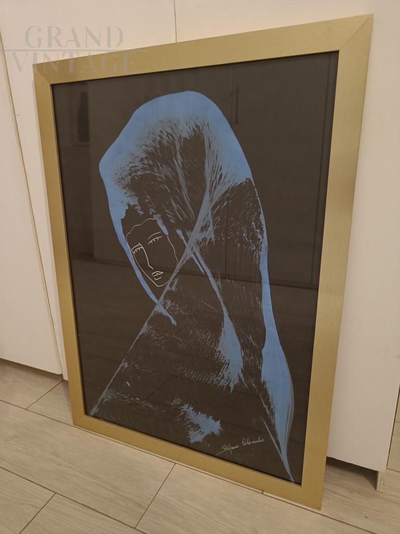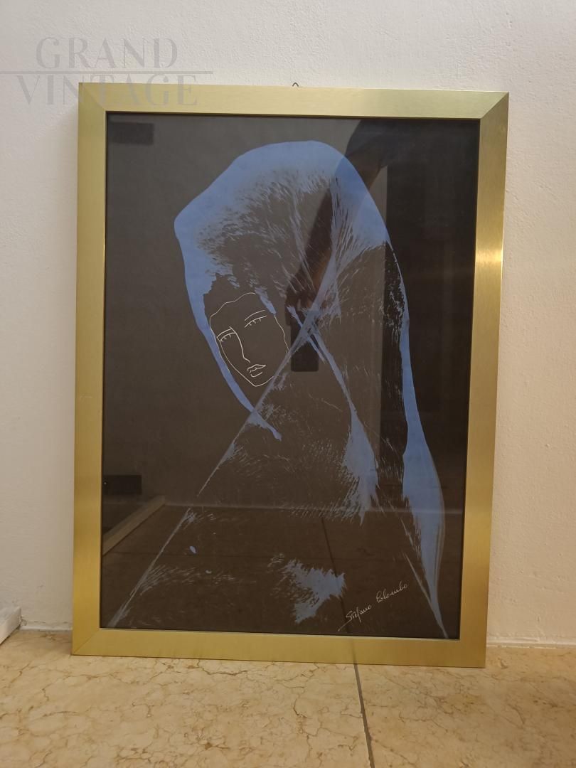 Magnificent painting by Stefano Colombo with a portrait of a woman in blue on a black background. On the back you can find a certificate stamp.