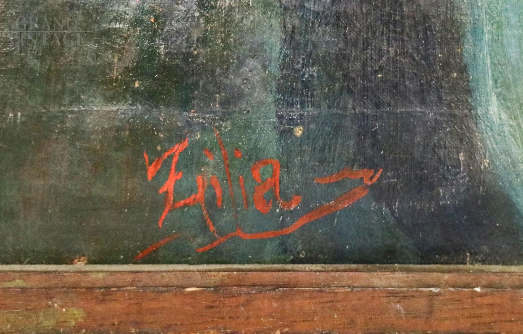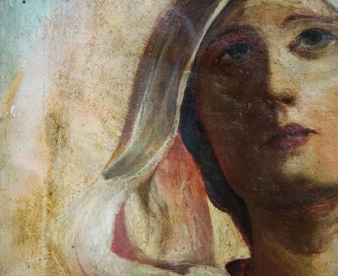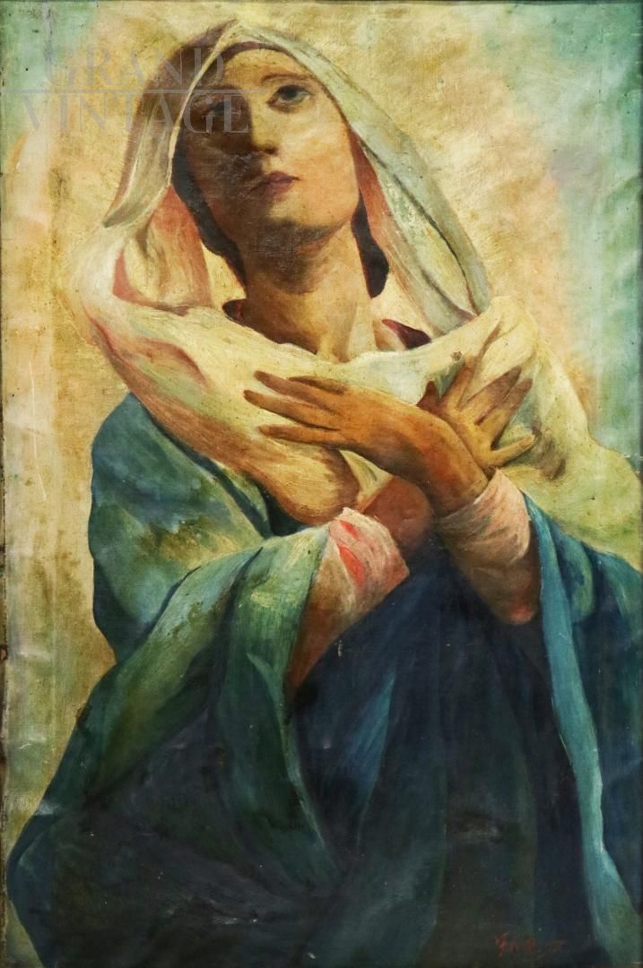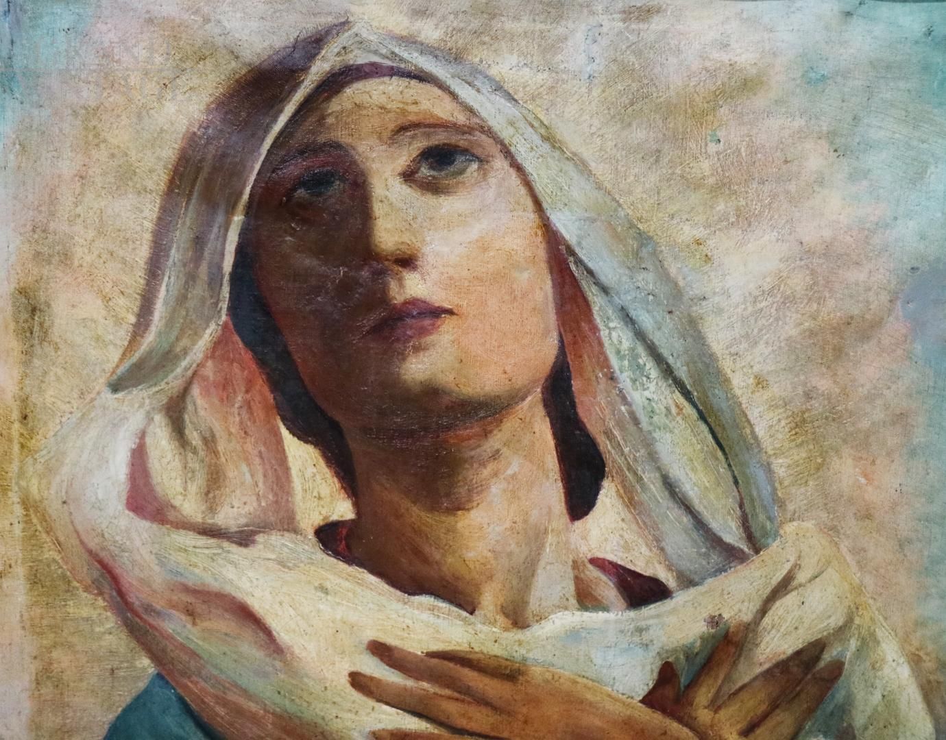 Oil painting on canvas depicting Madonna in contemplation with her hands on her chest. Signed lower right: Zilia. The artwork, presumably placed between the end of the 19th century and the beginning of the 20th century, requires surface cleaning.