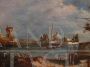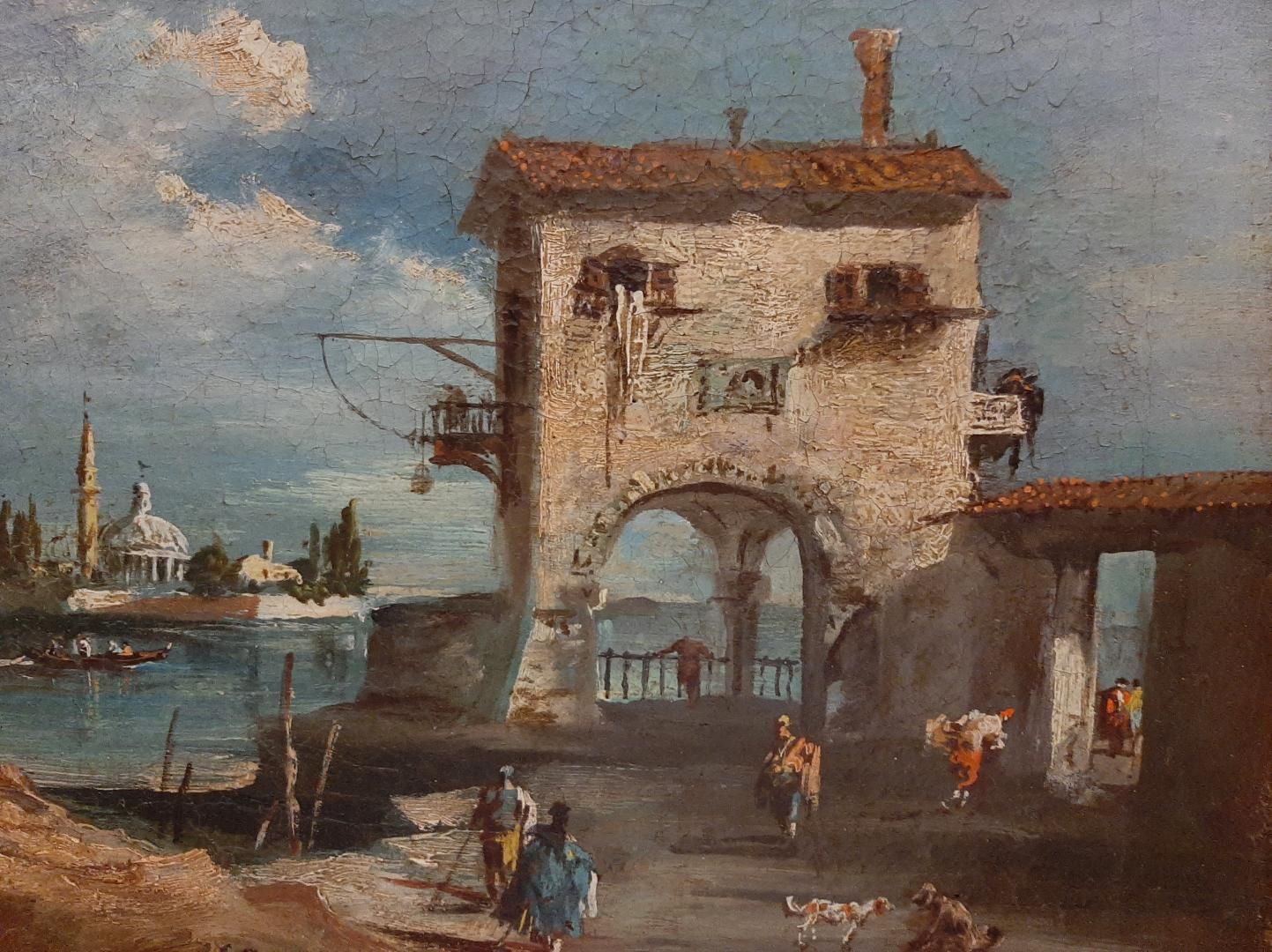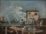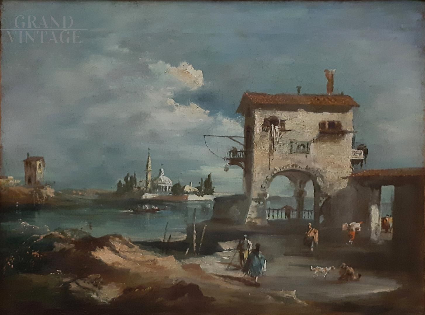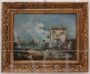 Italian school painting signed Zehnder, twentieth century, oil on canvas depicting a decorative landscape, typical architecture as Francesco Guardi's Venice artworks, within a gilded wood frame.