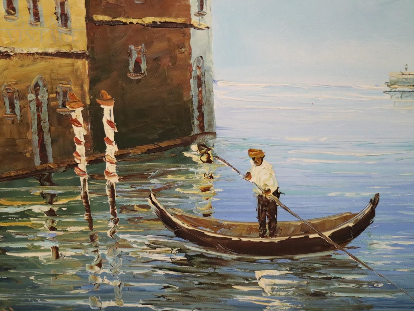 Late 20th century oil painting on canvas, mounted on a gilded frame, depicting a Venetian scene with a character and gondola.