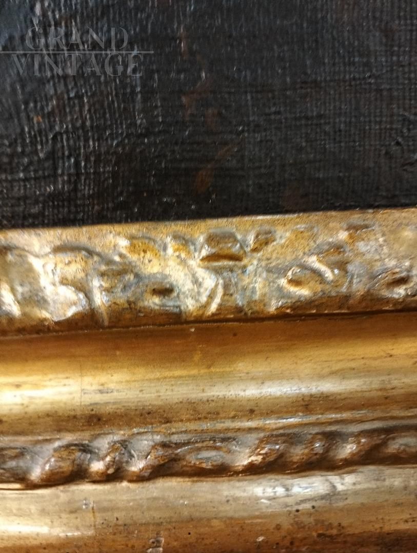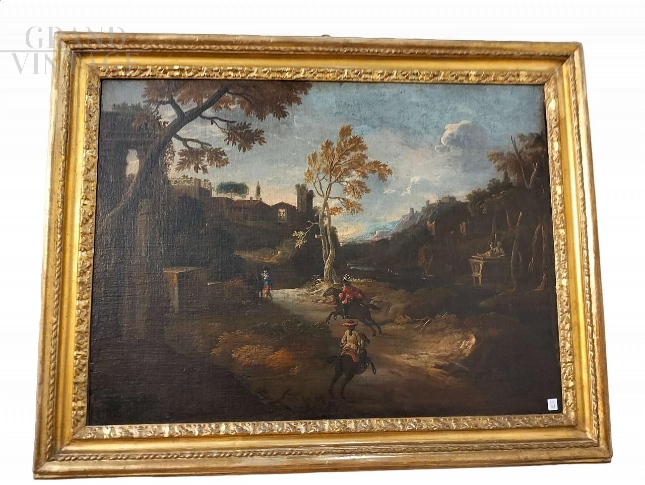 Painting depicting a hunting scene, created with the oil on canvas technique and framed within a golden frame. The painting is in excellent condition. The scene is set in a wooded countryside and centered on the movement given by the figures of the hunters on horseback. The large format highlights the important commission.