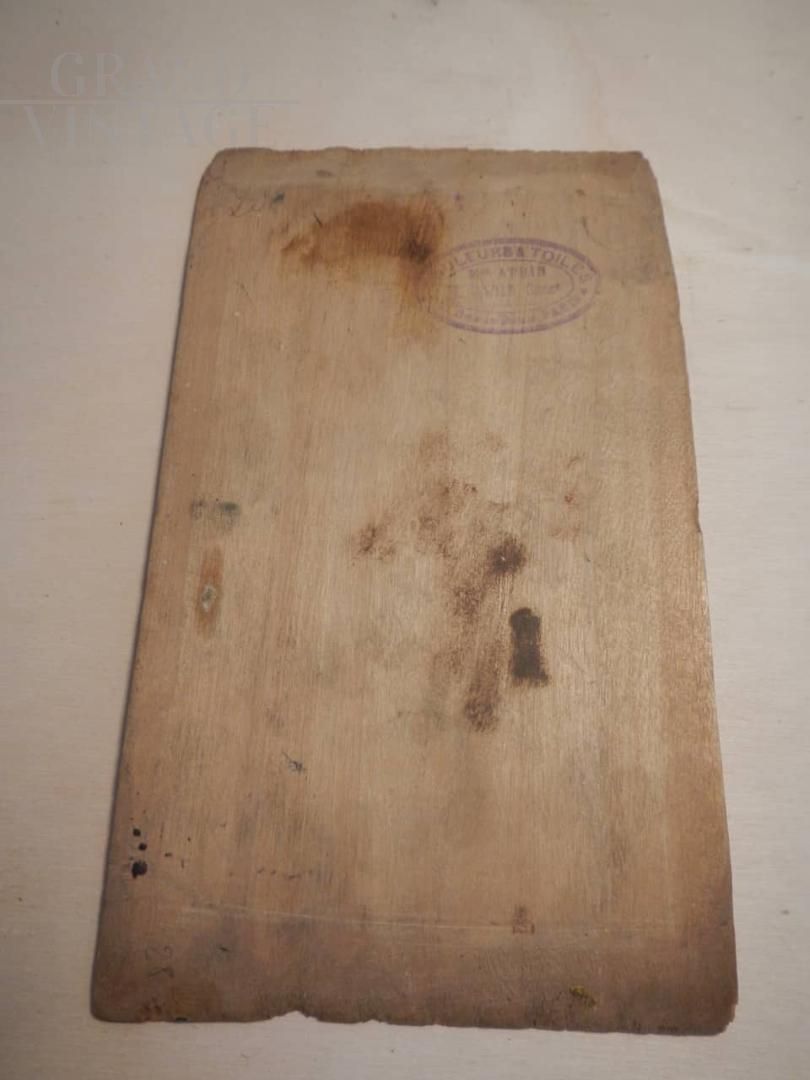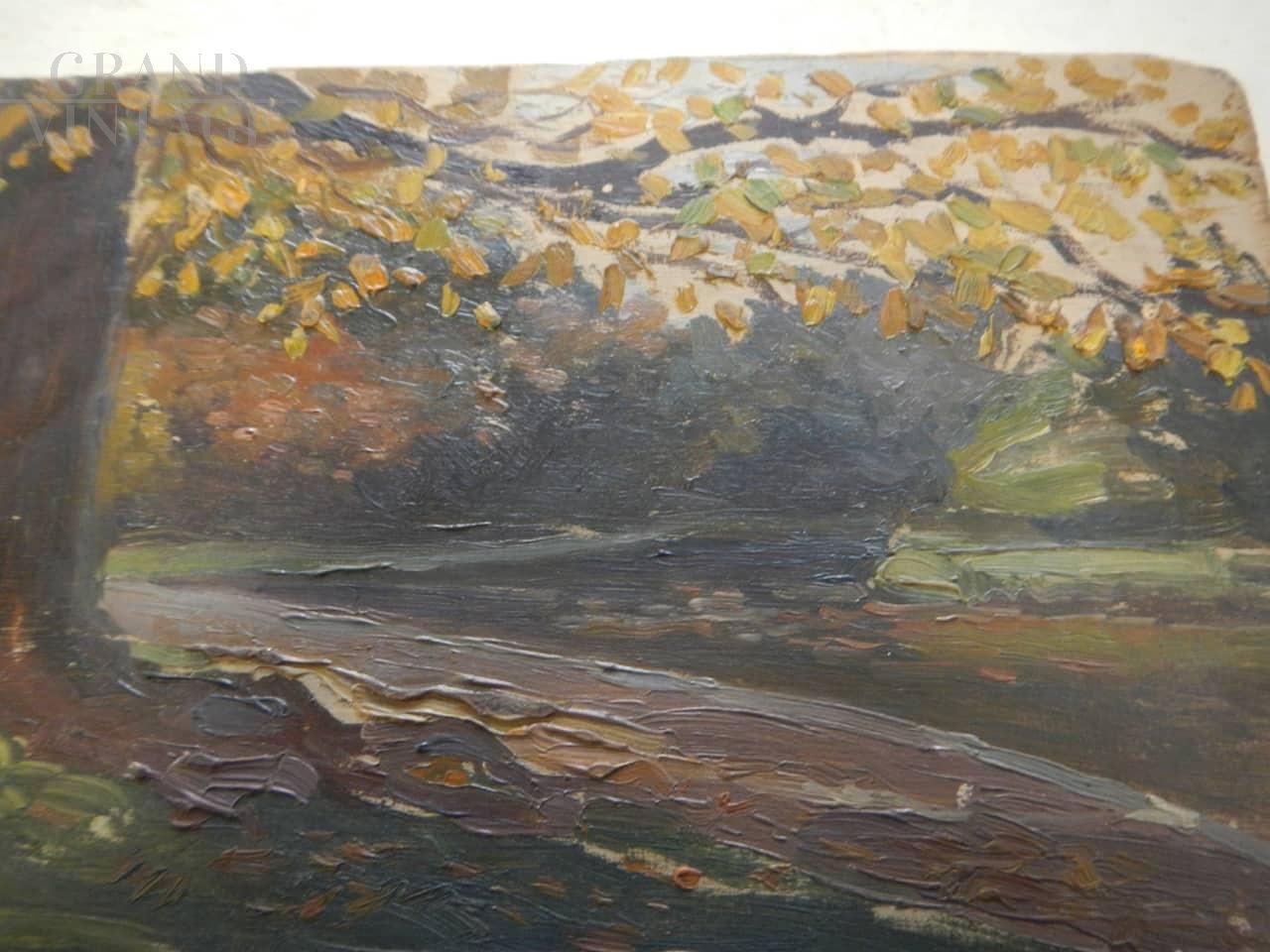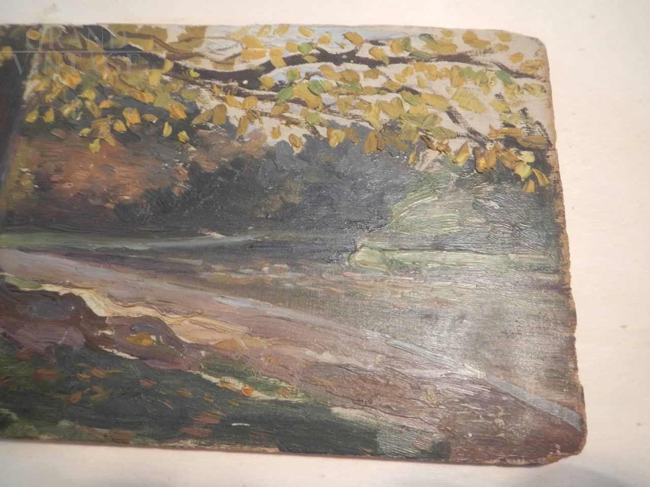 French painting with autumn forest, oil on wood, specifically on a paint box lid, which bears the production mark. The artwork can be dated between the end of the 19th century and the beginning of the 20th century.