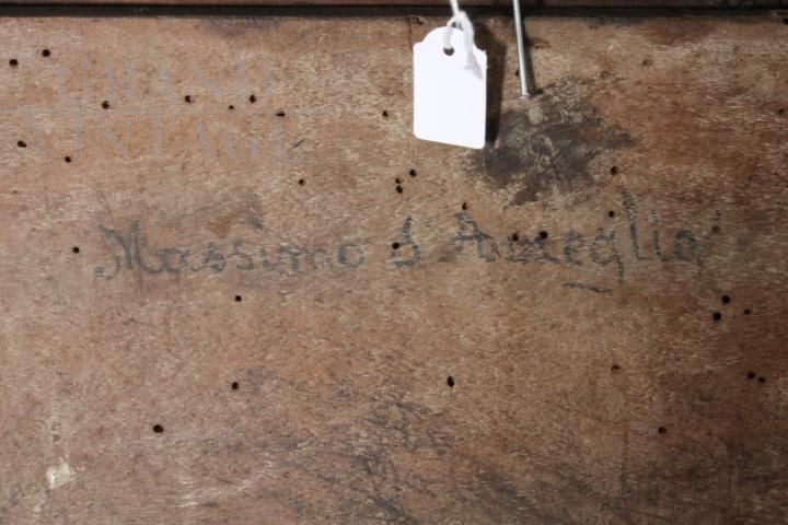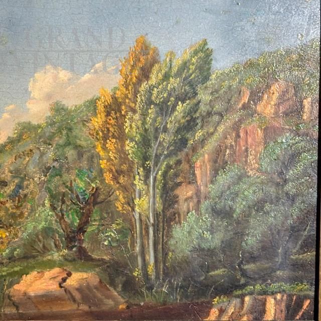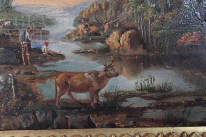 Antique oil painting on wood from the late 18th century depicting a bucolic scene with landscape, characters and grazing cows, signed on the back Massimo d'Azeglio, complete with antique gilded frame. Beautiful pictorial quality, made on walnut wood, in good condition.